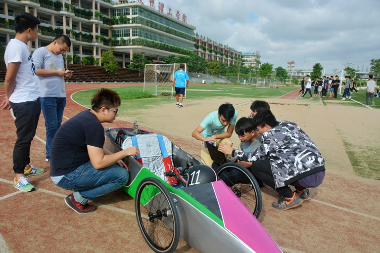 赖永伦与队员们正在分析数据 准备跑圈调试 调试中 检查设备 “轰轰轰……再快点,跑起来。”在操场上,一辆改装过的节能汽车正绕着跑道飞奔。10月20日,我校学生与台湾大叶大学学生正...