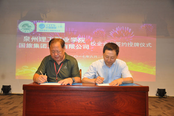 我校臧树良校长与国旅上海陆军先生签订校企合作协议 校长臧树良、特聘教授郑向敏向国旅上海陆军先生、王简先生颁发聘书 参观我校科研成果展 臧树良校长在校企合作签约仪式上发言 国旅上海董事总...