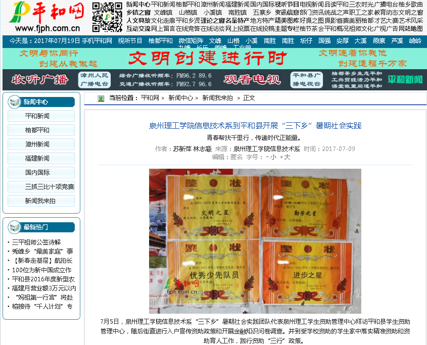 ——信息技术系“青春帮扶千里行,传递时代正能量”暑期社会实践活动 6月26日,由我校信息技术系与学生资助管理中心举办的“青春帮扶千里行,传递时代正能量”暑期社会实践活动正式启动。本次社...