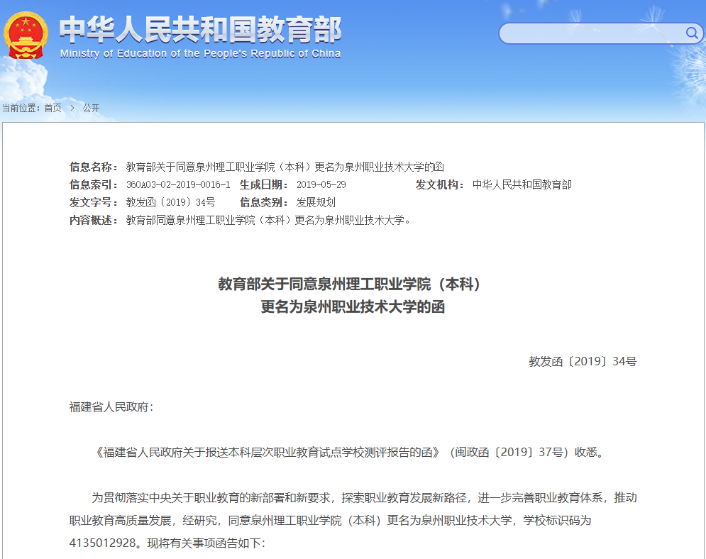 2019年5月27日,教育部正式函告福建省人民政府,“同意泉州理工职业学院(本科)更名为泉州职业技术大学,系民办本科层次职业教育试点学校。首批设置机械设计制造及其自动化、汽车服务工程、计算机应用工程、土木工程...