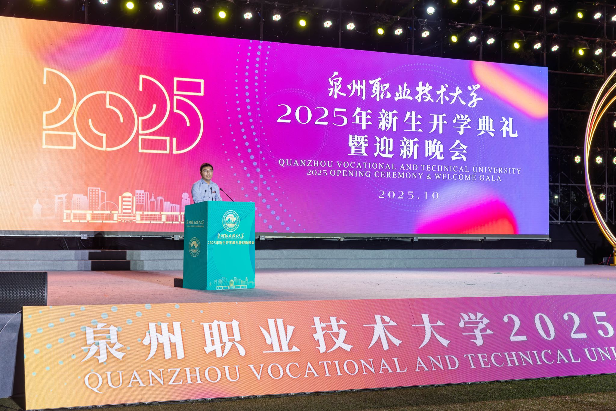 女士们、先生们,尊敬的各位来宾,亲爱的老师、同学们:大家晚上好!秋风乍起,秋意渐浓。这个时候天空还来了一阵小雨,在闽南,每当吉庆的日子,下雨被视为一种吉瑞,是一个祥兆。今天晚上我们这座年轻的校园因大家的到来而焕发着勃勃生机。首先,我谨代表学校,诚挚地欢迎2025级的全体新同学加入泉州职业技术大学大家庭,欢迎远道而来参加国际青年交流营的马来西亚、菲律宾、泰国的师生们,更欢迎我们海内外产业伙伴们的到来...