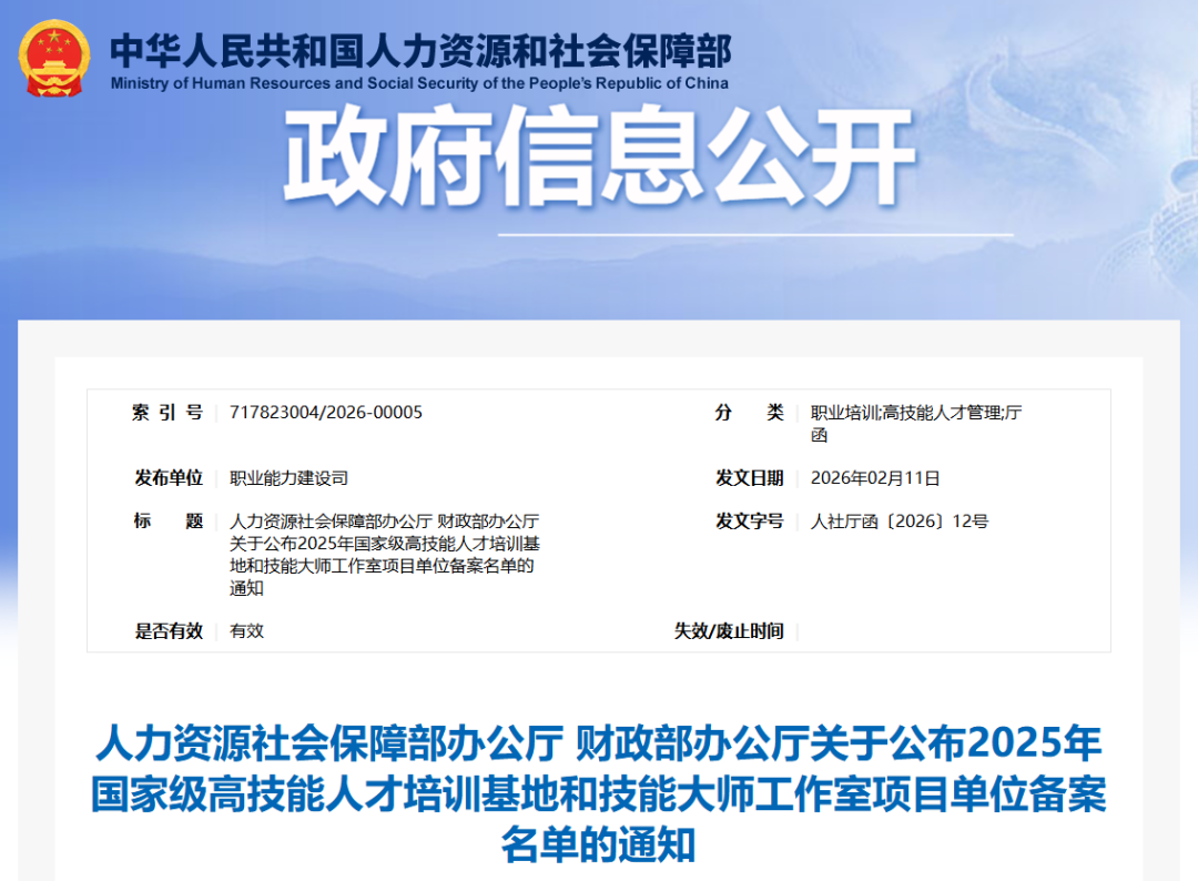近日,国家人力资源社会保障部办公厅、财政部办公厅联合发布《关于公布2025年国家级高技能人才培训基地和技能大师工作室项目单位备案名单的通知》(人社厅函〔2026〕12号),确定泉州职业技术大学等113家单位,为2025年国家级高技能人才培训基地项目单位。这标志着我校在高技能人才培养、产教融合创新、服务区域产业发展上,再获国家级认可与支持。学校前身是创办于1986年的晋江摩托培训学校,在改革开放的浪潮中应运而生,开启...