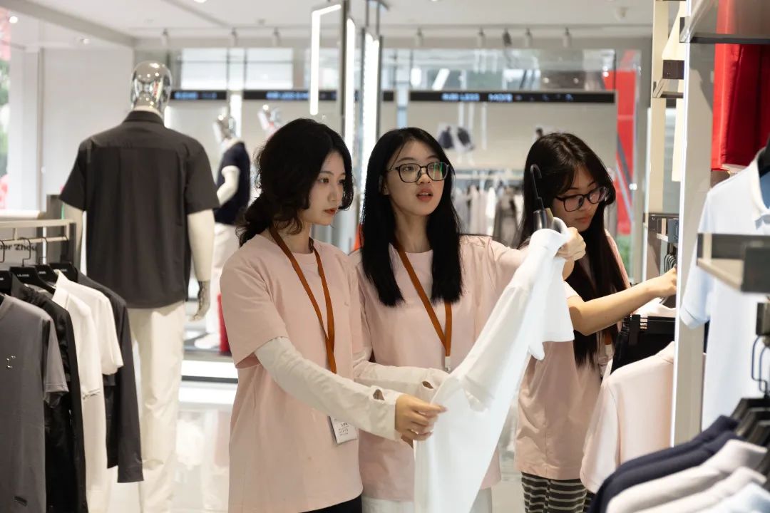 ▲ 利郎轻商务展厅店长助理周蓥(左)介绍本次泉大学子实训情况
