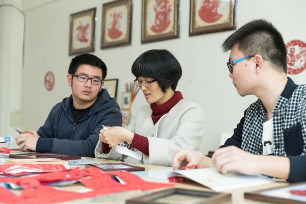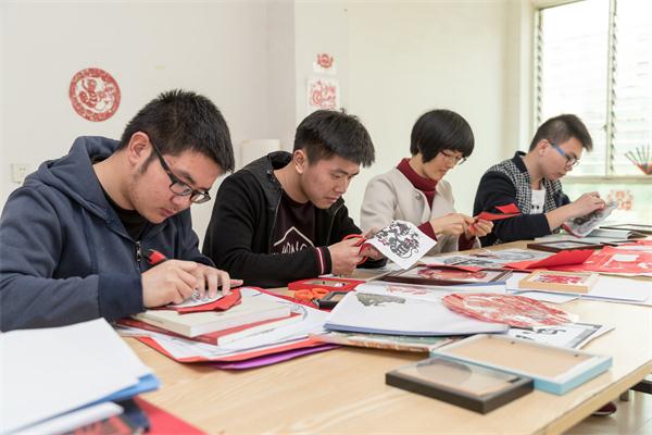 在剪纸工作室内,学生认真地学习中国传统文化--剪纸工艺