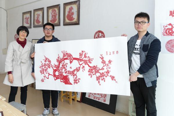 曾芳芳老师与同学们一起展示“喜上眉梢”传统剪纸工艺作品