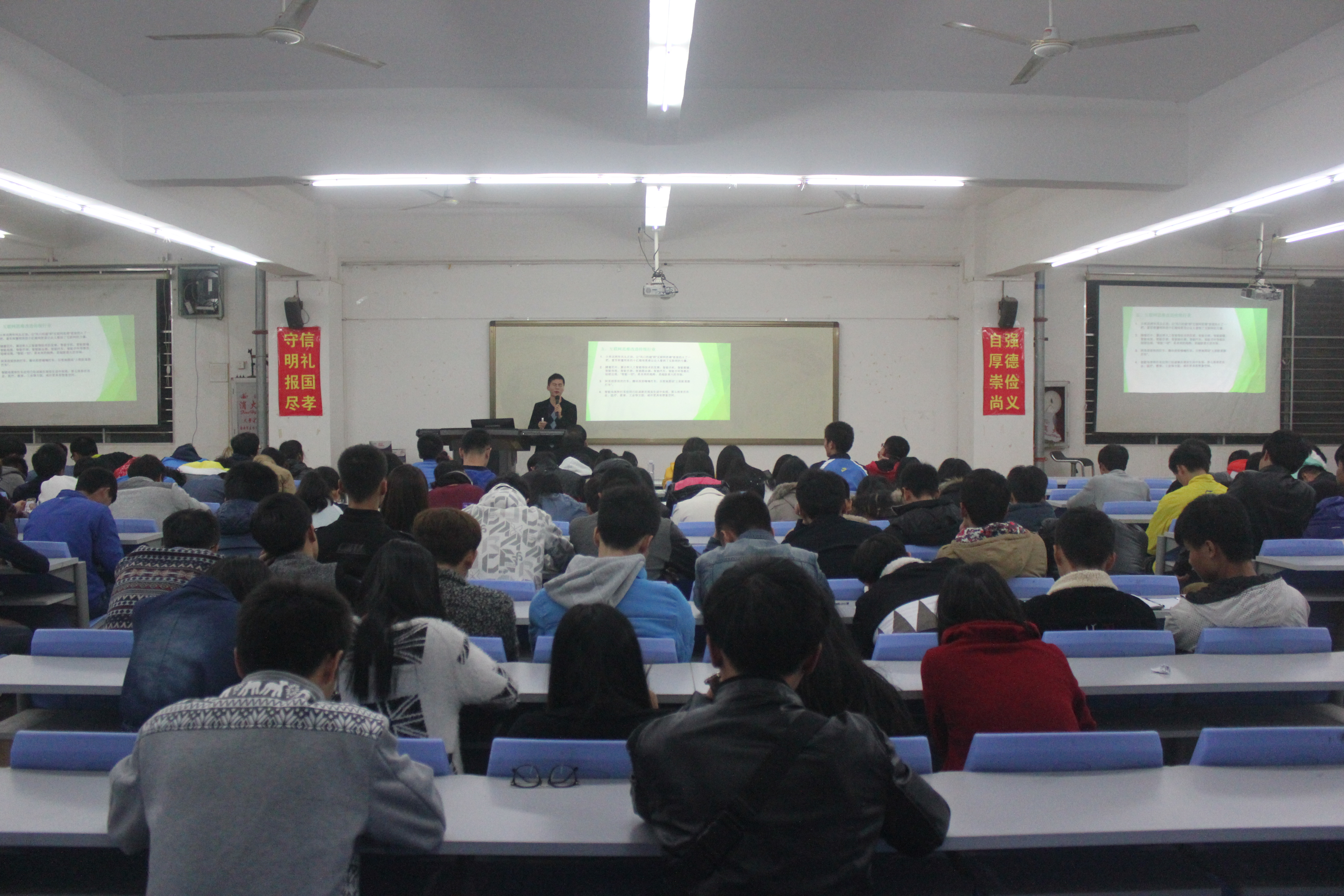 随着互联网时代的日益更新,人们的生活已经离不开互联科技,那在这互联网时代会有什么样的新机遇呢?2014年12月7日晚,泉州新丝路电子商务有限公司总经理林时来在238教室以“互联网时代下的新机遇”为主题为大家带来精彩演讲。本次讲座有来自电商、物流、营销等200多名学生参加,我校副校长于雷、商学院院长助理吴剑锋、招生就业处黄世强、商学院郑洁如、蔡婉瑜老师出席本次讲座。