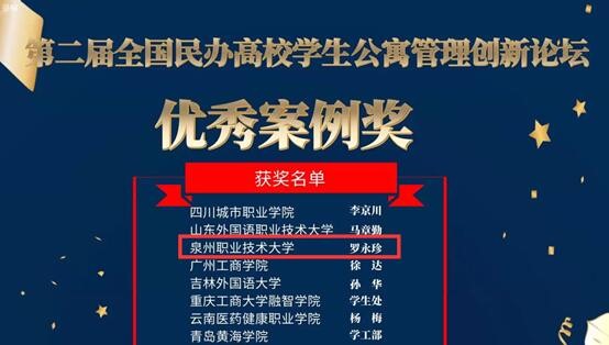 此外,在此次评选民办高校学生公寓管理案例征集中,我校罗永珍老师的《住宿书院制建设》荣获《第二届全国民办高校学生公寓管理创新论坛优秀案例奖》。