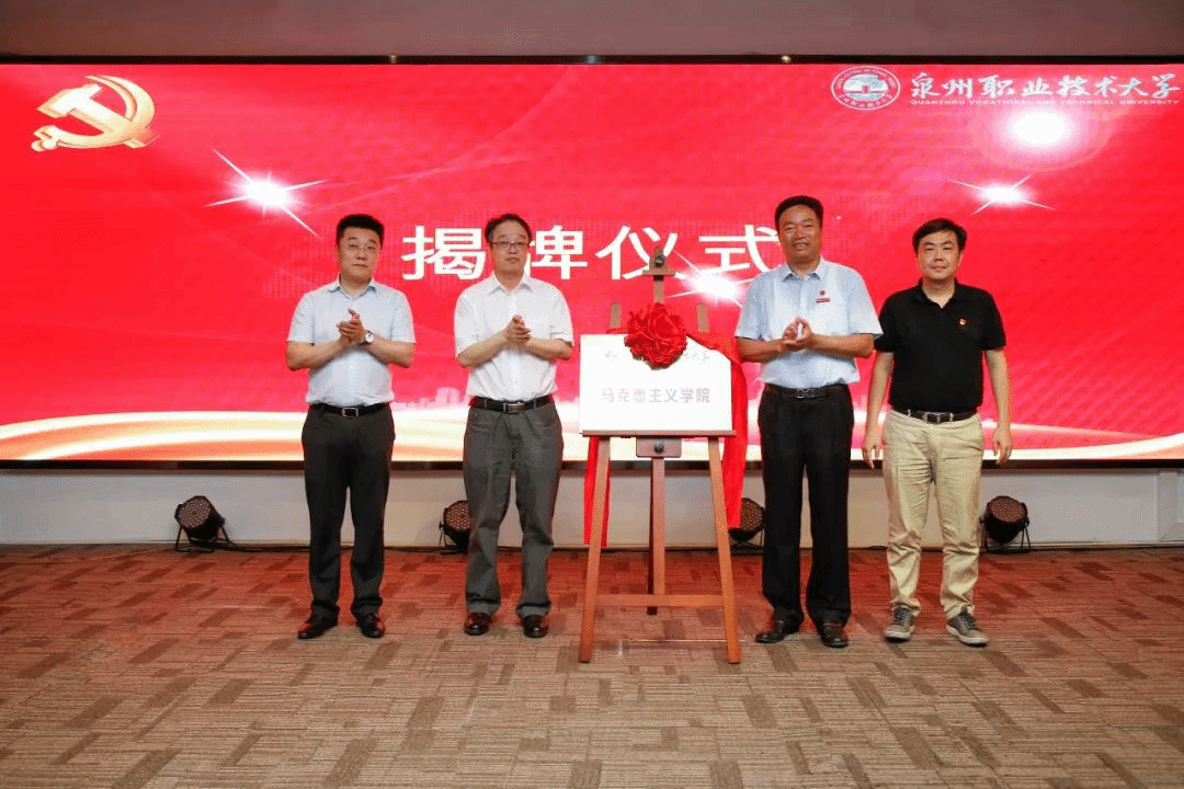 中国历史研究院副院长钟君研究员、福建社科院副院长刘小新研究员、党委书记林其天、泉州市高教发展中心办公室主任陈志刚为马克思主义学院揭牌