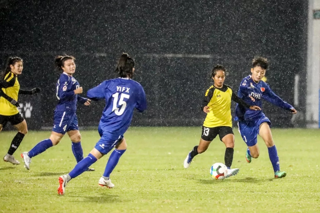 第5分钟,东华大学队16号球员尤丹丹带球走中路,在弧顶附近起脚远射,皮球打在对方球门横梁下沿后入网。东华大学队1:0,暂时领先。