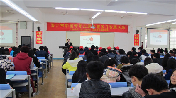 为贯彻落实青年网络文明志愿者电视电话会议精神,弘扬雷锋精神,普及青年志愿服务理念,3月7日上午,晋江团市委联合我校团委在我校238教室开展中国青年志愿者服务日专题活动。泉州团市委纪检组长黄俊荣,泉州市直团工委书记黄华君,晋江团市委副书记卢奕珠、吴剑文,我校党委副书记吴滨如、团委书记蔡金佩以及青年志愿者近300人参加了活动。