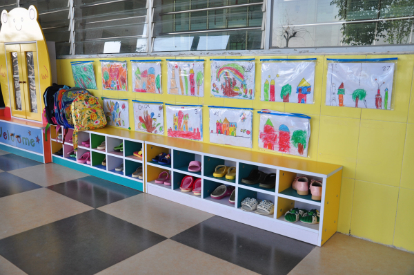 小朋友的鞋子、书包都整整齐齐的放在柜子里