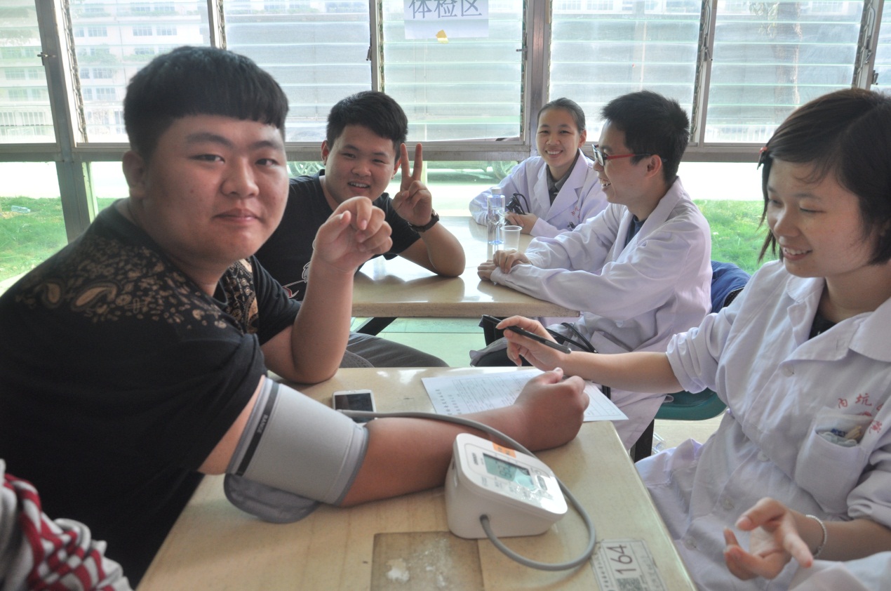 面对献血,同学们很淡定,献血前的身体检测