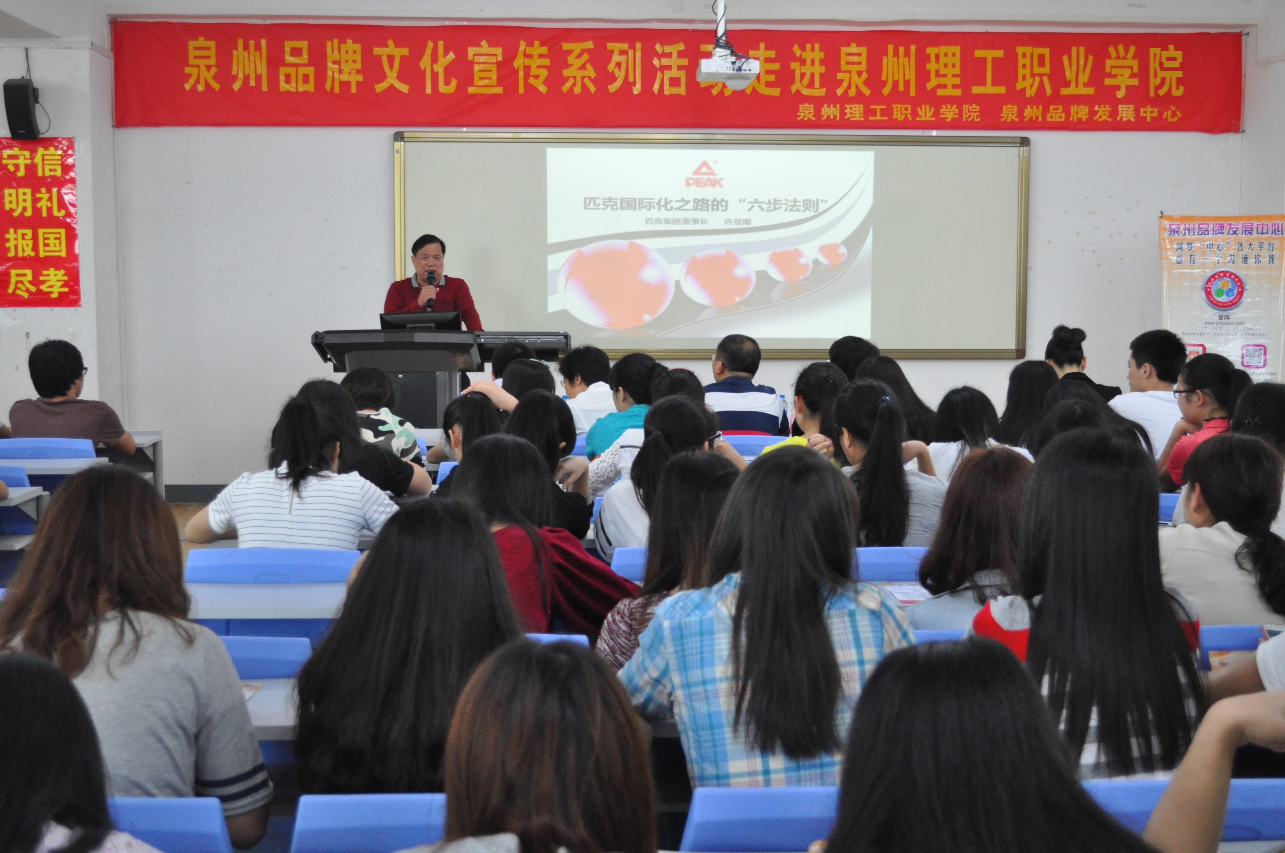 2014年5月14日,由泉州品牌发展中心与泉州理工职业学院主办的泉州品牌文化宣传系列活动走进泉州理工职业学院在东教学楼238教室举行。校副董事长吴滨如,校团委书记、学工处副处长蔡金佩,泉州品牌发展中心主任刘文镇、副主任李梅茹,匹克集团有限公司董事长许景南,泉州世界贸易中心商务总监林舒以及泉州理工职业学院200余名师生代表参加本次活动。