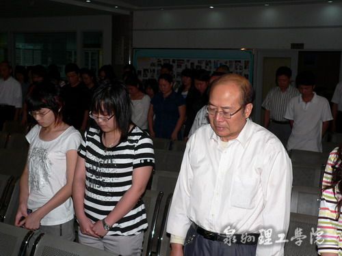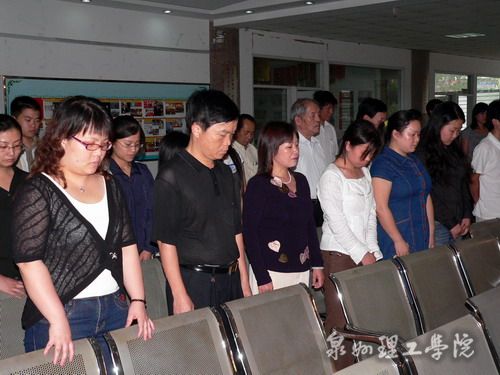 下午14时28分,泉州理工学院全体师生员工集体为汶川大地震遇难同胞默哀三分钟。此时,雨滴淅沥、汽笛长鸣,浓浓的哀思萦绕在校园的每一个角落。