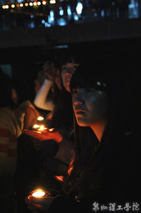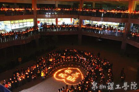 4月20日,对于全国人民来说是一个难忘的日子。早上8点02分,四川雅安发生7.0级地震。灾难的发生牵动着亿万中国人民的心,同样也时时牵动着泉州理工学院师生们的心。天灾无情,人有情,晚上20时,师生们陆续前往食堂,环绕食堂1-4层有序站立。在地下一层,师生们用手中的蜡烛在地上围成了一个大大的“心”形图案,中间拼成“雅安加油”字样,为远在千里之外的雅安同胞们加油鼓劲。低沉感人的地震纪实片瞬间拉近全场师生的距离,拉近师生们与雅安同胞间的距离。师生们手托蜡烛,目视烛光,为地震中罹难的同胞默哀一分钟。庄严肃穆的默哀,闪闪的烛光,师生们满怀真情,用蜡烛点亮去往天堂的路,祝愿地震中遇难的雅安人民一路走好!