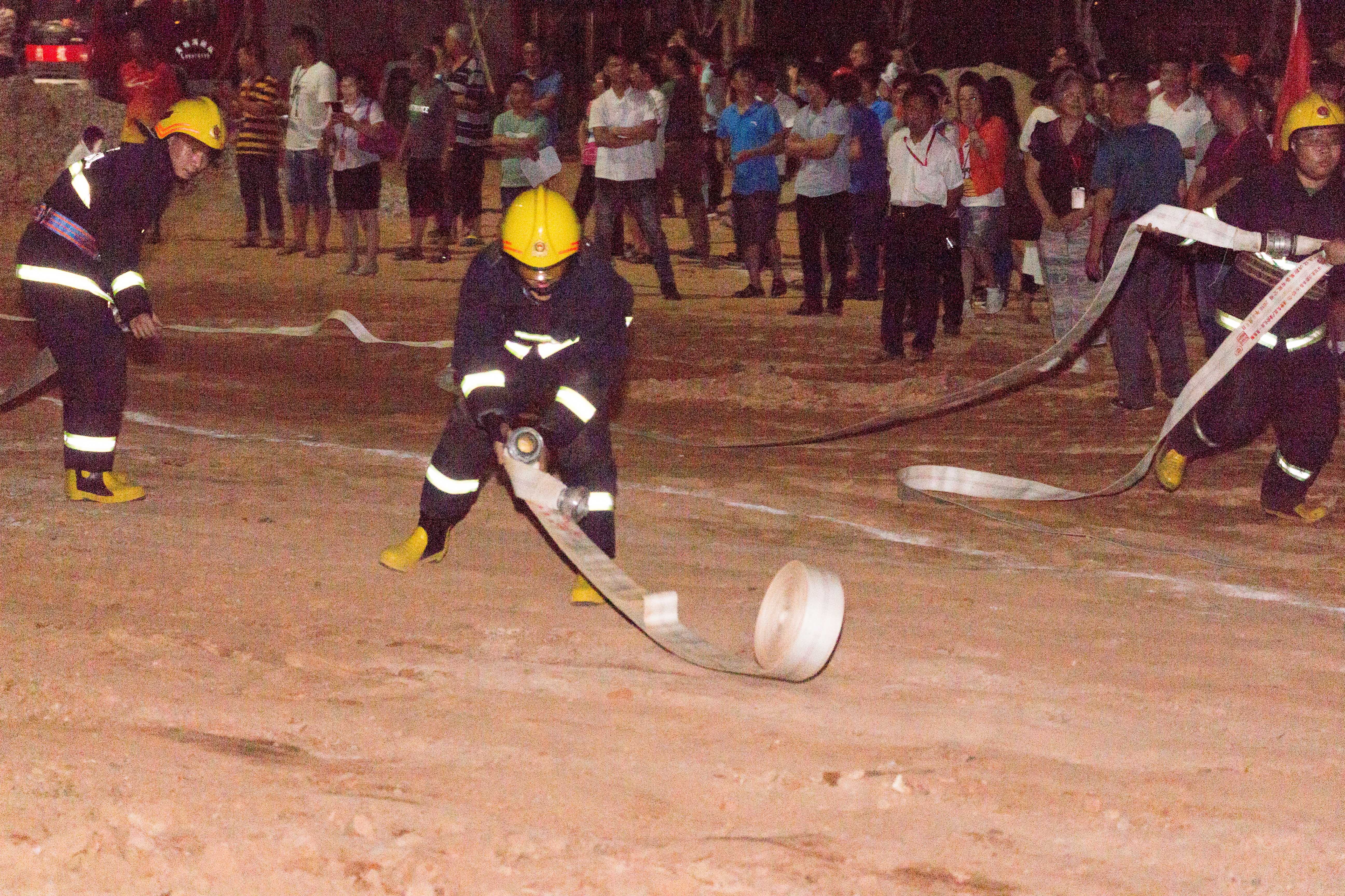 消防水带铺设演示中,内坑镇专职消防队员及我校微消防站队员通过抛、扔、铺、卷、收等动作要领对全校师生进行动作展示,在火势万分危急的场景下,用最快的时间将消防水带铺设好,连上消防水泵,抽水进行火势扑救。