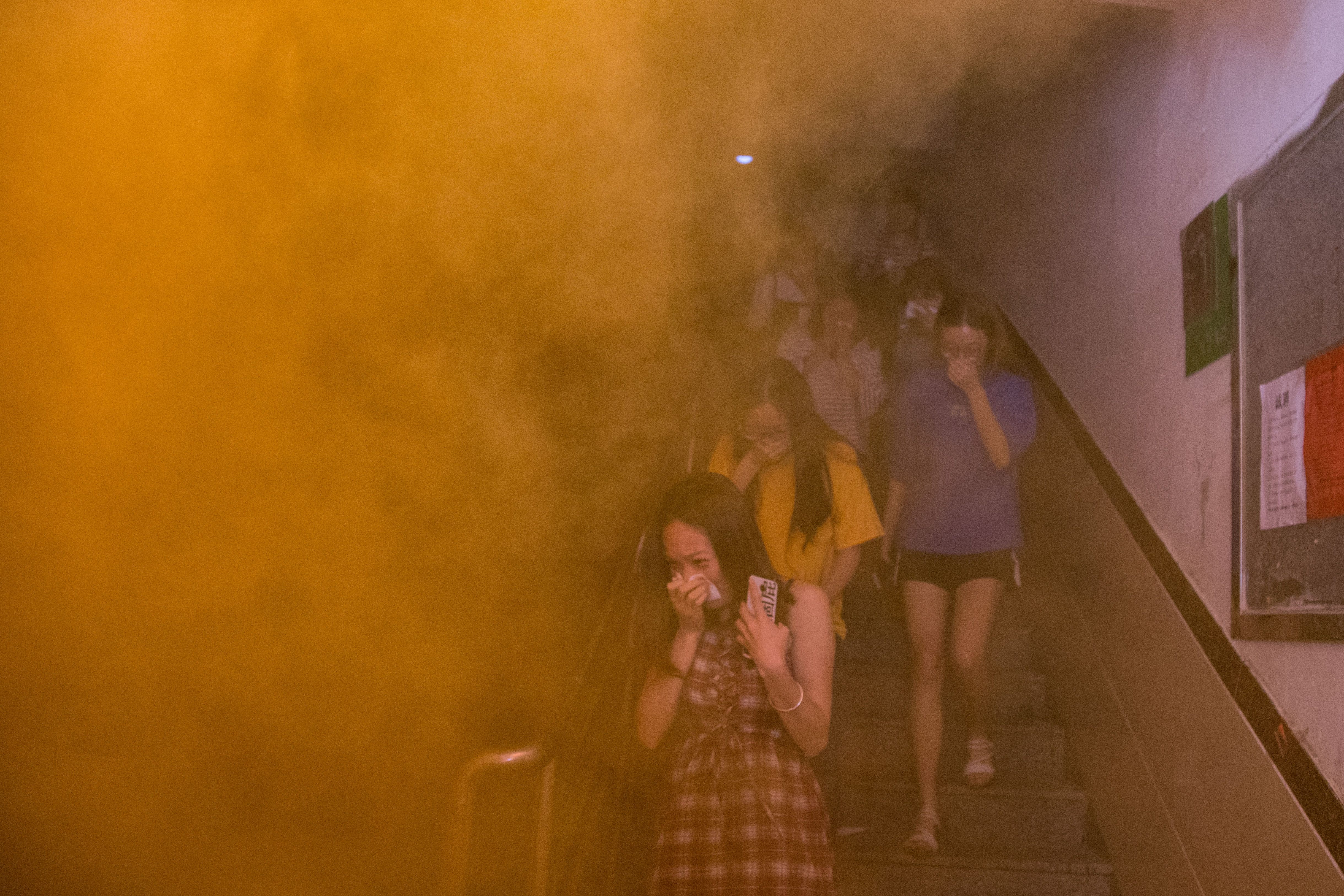 当晚7时许,校园地震、火灾警报声急促地响起,校舍内冒起浓浓的烟雾,学校广播立刻提醒师生们不要慌张,要安全有序地向操场撤离。师生们听从现场指挥的口令,纷纷弯着腰、用毛巾捂住口鼻,沿着指定楼梯口,快速、有序地撤离。