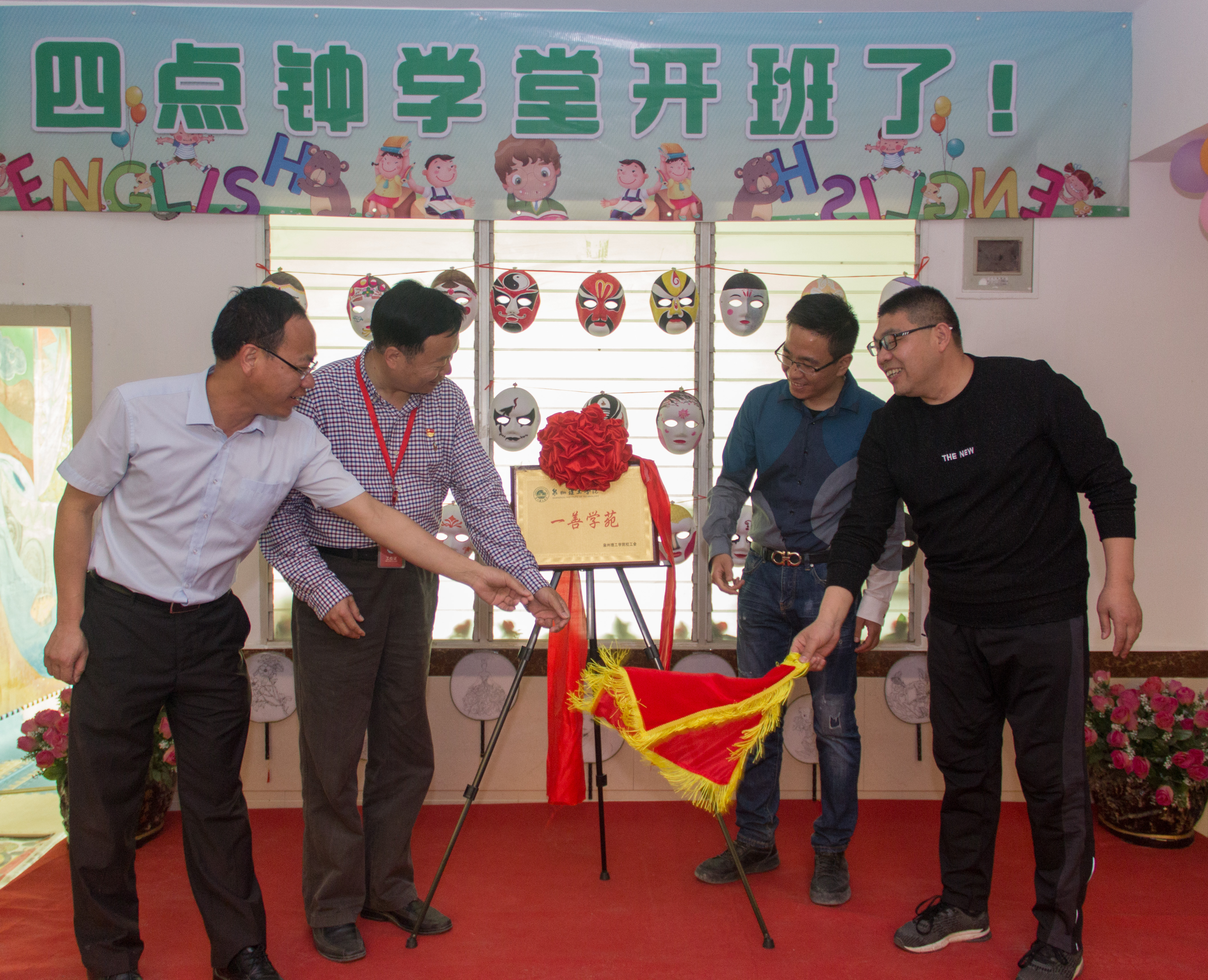 开班仪式上,校党委书记林其天研究员,党委委员、学工处处长杨津平老师,党委委员、校工会主席陈其生老师,理工石材设计院张翔鹏董事长一同上台为四点钟学堂进行揭牌仪式。