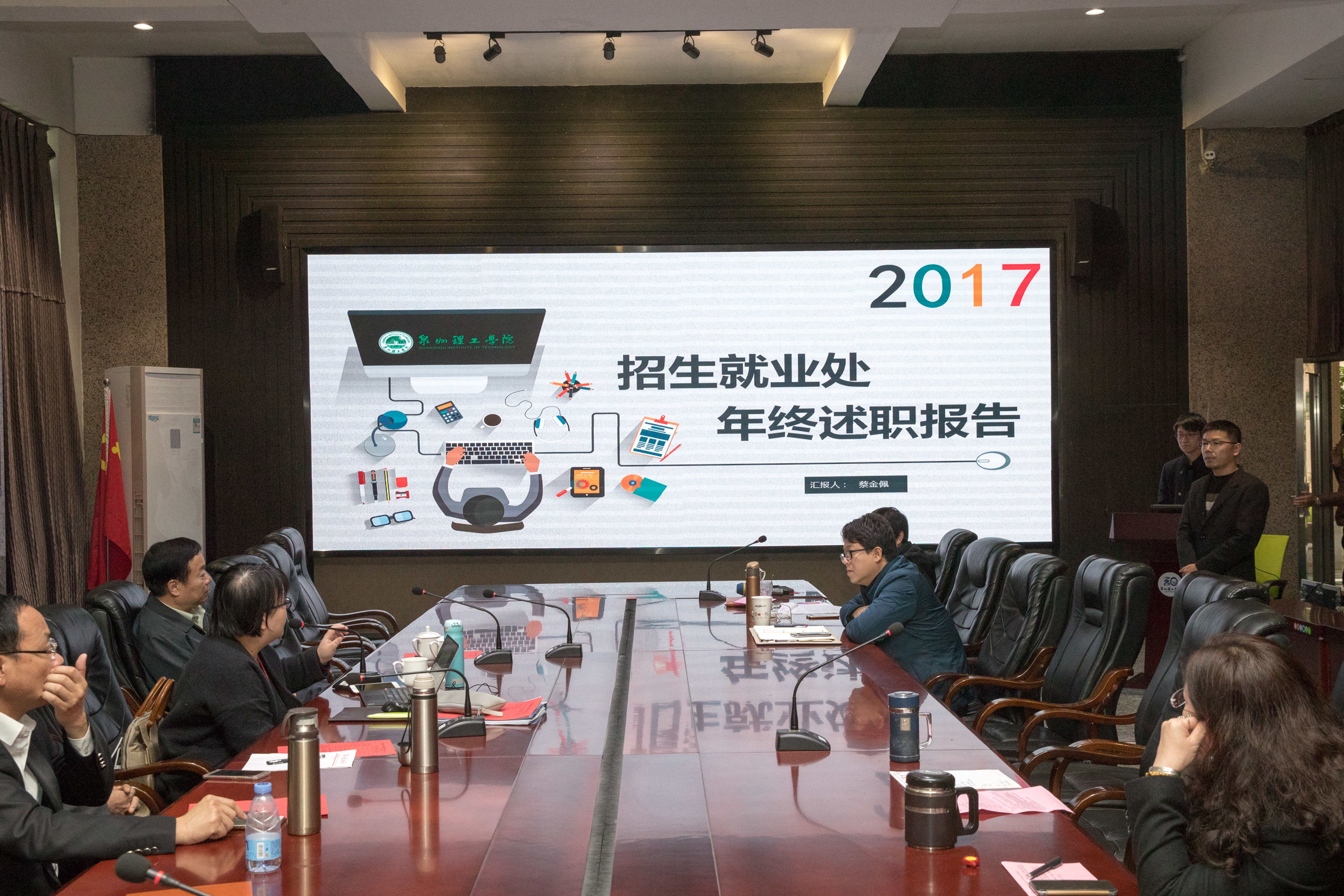 学工处在大学生活导论、校地共建、“三位一体”育人等方面提升,在百名学生助理、书院制管理模式创新,在资助工作、科研成果突破。2018年将以转变职能提升格局、运用数据科学育人、凝练项目打造品牌、实践理论专业专家为工作思路。招生就业处报告2017年新生报到率同比增加0.23%,晋江生源同比增加1倍,理工科率同比增加4.85%,在晋江就业人数291人,同比去年增加4.82%。2018年招生工作迎来新时代,要打好进口关,推动招生目标;管理把好出口关,打造就业质量工程等。三创学院在三创教育实践、推动项目立项等方面进行报告,2018年将以搭建平台,项目推动,促进三创资源共享与对台交流合作为主题开展工作。