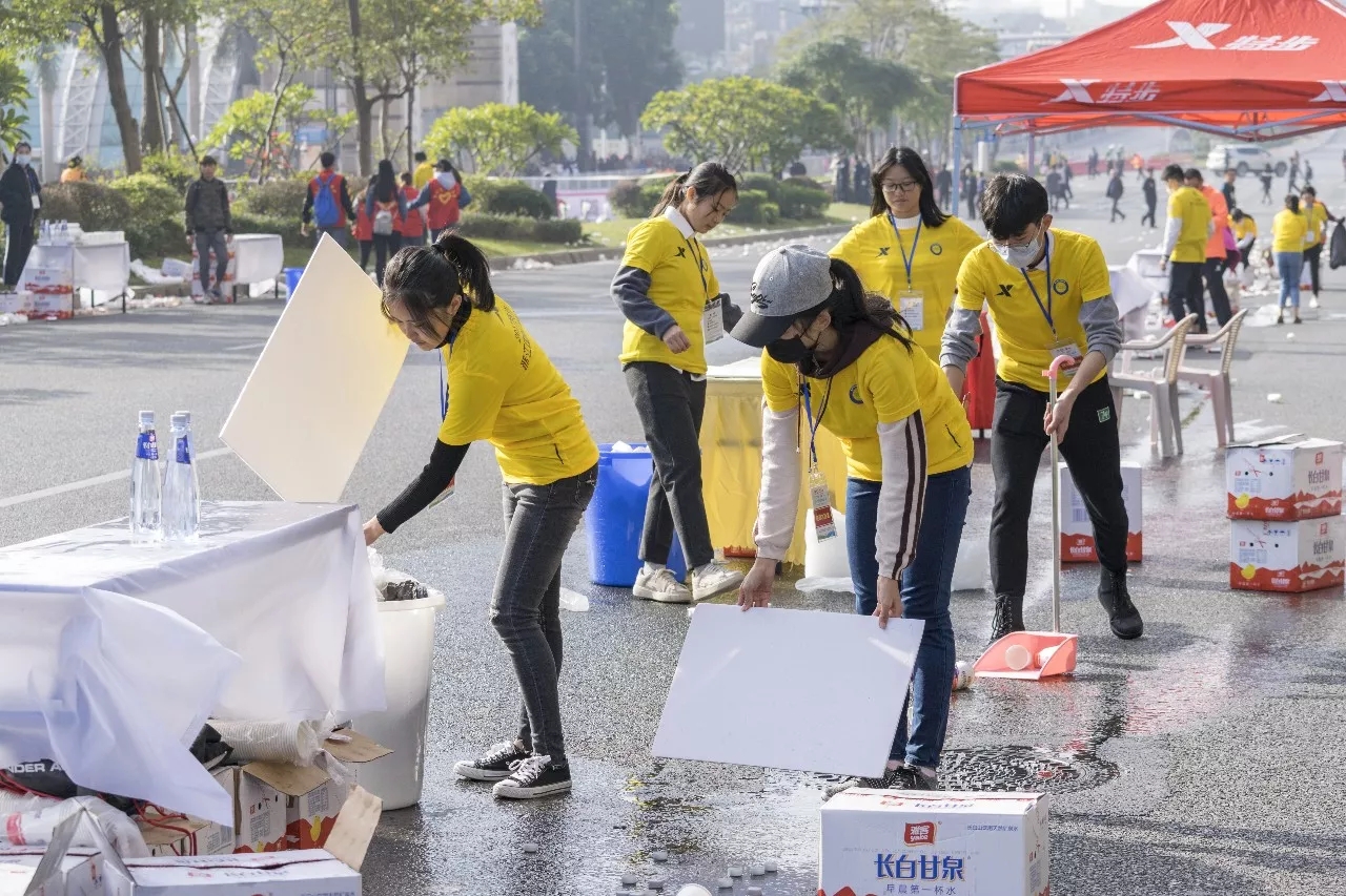 产品艺术设计大一学生黄炎鑫负责32.5公里赛段的补给点。作为志愿者,除了为参赛选手提供饮水、饮食补给服务,他还会为赛场上的理工健儿加油打气。