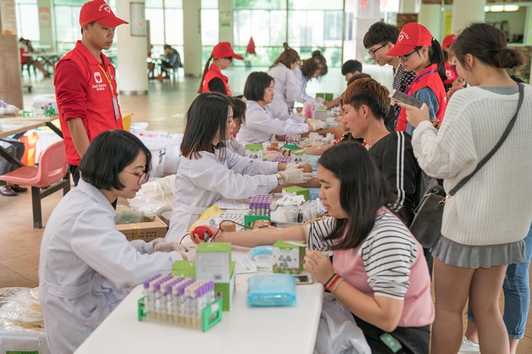 在采血点中,看到了一个熟悉的身影--学校副董事长吴璐吟。她正向医务人员询问着献血需要的注意情况以及献血的对身体的影响。医务人员告诉她说,献血可以促进新陈代谢,有效降低血液粘滞度,预防多种疾病。吴副董听后,毫不犹豫地填了表格,献了血。