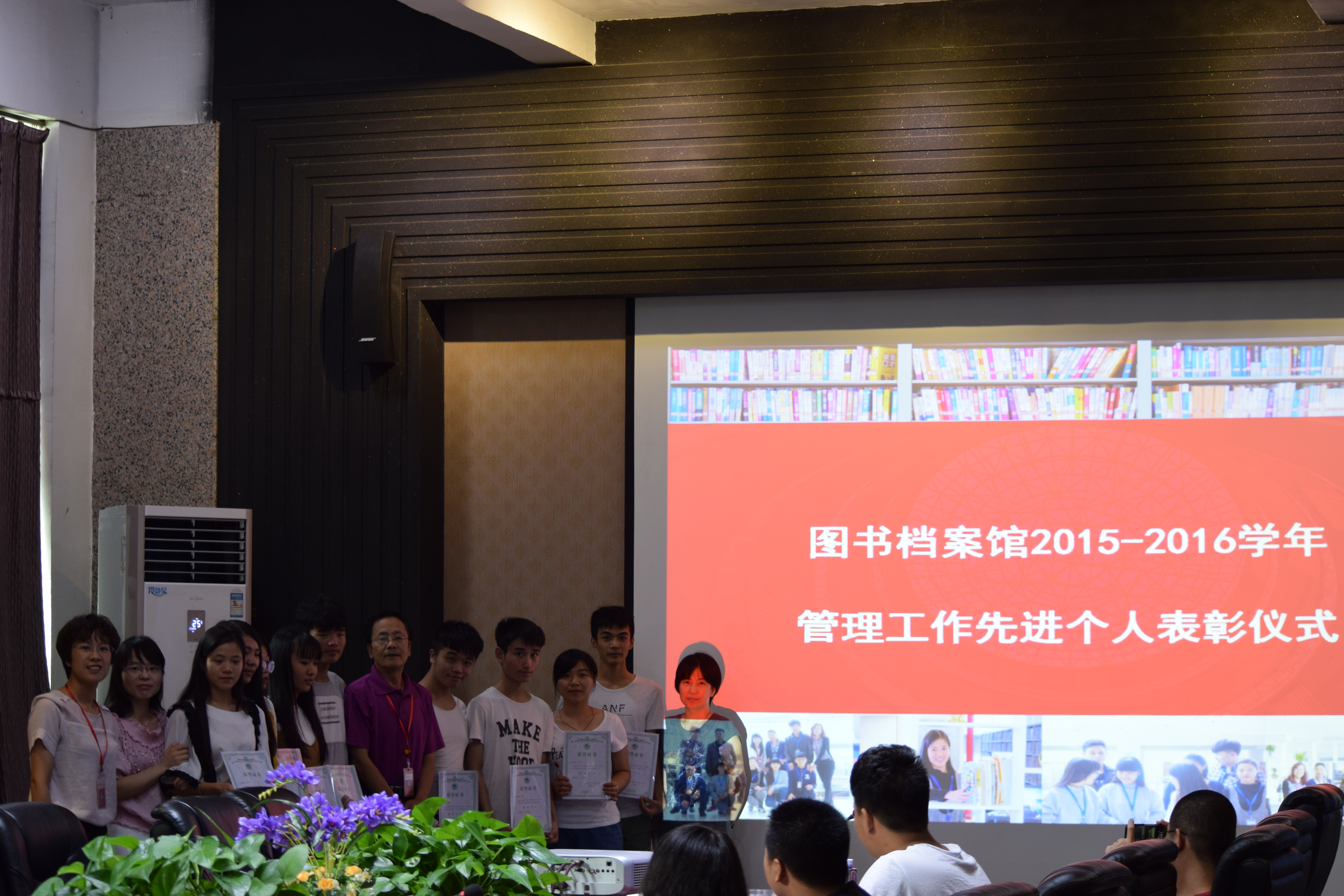 第三项议程是表彰图书档案馆2015-2016学年度为图书档案工作做出贡献的先进个人,由于校长和吴副董事长为他们进行颁奖,获奖的馆员有:林国清,阮翠珍,陈恳,潘晓玲,方燕珠,洪泽松,李原涛,刘斌雄,林峰,王清华,黄聪斌,沈招玲,希望以上馆员在今后的工作和学习中能再接再厉,做出更好的成绩。
