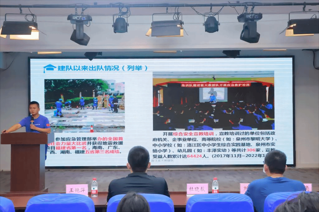 杜晓航做土耳其救援专题分享,首先播放土耳其抗震救灾纪录片。短短6分钟的视频振奋人心,向在座师生展现本次国际救援面对的困难及风险,同时也彰显中国蓝天救援队的大国风貌。在土耳其地震发生后,中国官方和民间救援力量迅速奔赴灾区一线,晋江市蓝天救援队一行5人,于2月7日12时从泉州出发,飞行两天多抵达土耳其马拉蒂亚灾区参与中国援助土耳其抗震救灾行动。期间,蓝天救援队救援员克服长途奔波、异国时差、零下10多度大雪恶劣气象等影响,在灾区余震频繁、道路电力供水中断、后勤保障极端缺乏的情况下,在国际救援组织和当地指挥部的统一协调下,夜以继日展开联合救援行动。截至当地时间2月16日,蓝天救援队共搜寻到46人,其中幸存者3人,遇难者43人。讲述事迹过程,每一次话语刚落,现场都会响起掌声。