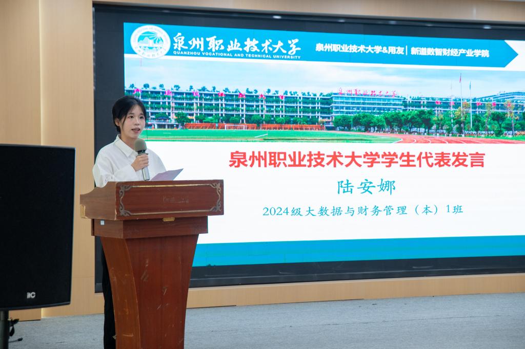 2024级大数据与财务管理专业的陆安娜作为学生代表,对学校和企业提供的提高个人能力、实现自我价值的平台和机会表示感谢,呼吁同学们在数智财经产业学院不断深耕,共同用智慧和汗水在产业学院这个平台浇灌出属于自己的人生之花。