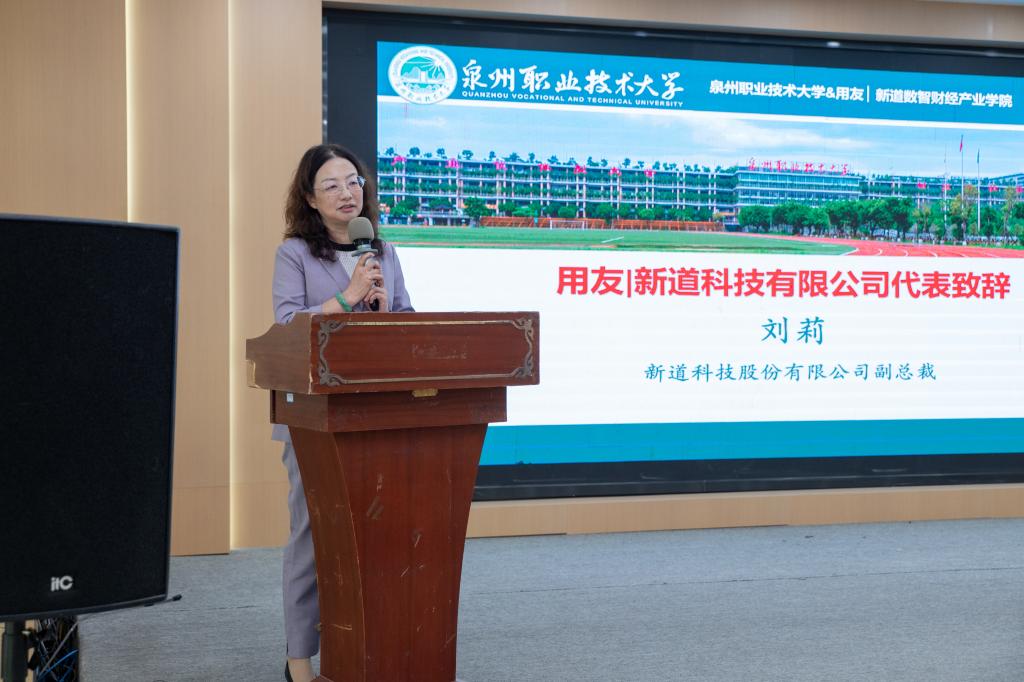 刘莉代表新道科技有限公司致辞,介绍用友企业36年来的发展历程。她表示,要以业财融合、数据服务为核心,培养学生在数字时代下构建财商、数商、业商和创商等四大能力,并希望校企双方进一步深入产教融合,将企业内新理念、新产品、新应用、新技术融入到学校人才培养方案和课程体系建设中,培养更多创新型、复合型人才,助力区域经济发展。