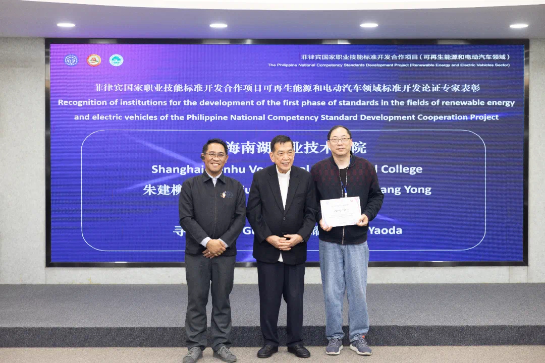 我校作为“可再生能源和电动汽车”领域中方职业院校总召集人,在过去的5个月时间,与本领域8所院校共同推进6个标准的开发工作,圆满完成任务。在成果交付仪式上,吴滨如将《菲律宾国家职业技能标准开发合作项目“可再生能源和电动汽车”领域期成果》交付给埃尔·西德·卡斯蒂略,张红阳、段建同台见证。