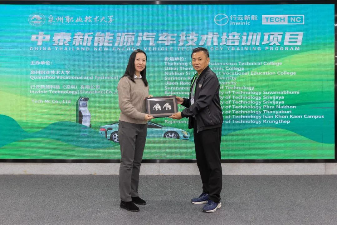 ▲ 泰国TECH NC集团董事Komate Jullakarin向泉州职业技术大学副校长林文艺、行云新能院校运营总监王克静赠送纪念品