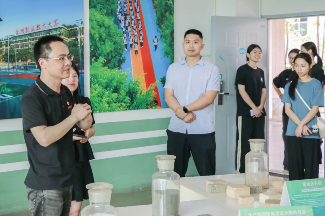 在绿色建筑成果展厅内,张艺能带领同学们依次参观了生态园区规划与设计展区、绿色施工方法展区以及功能性建筑材料的展区。他向大家详细介绍了学校节水利用的示范模型、新型墙体技术、新型旋转气流百叶窗,以及具有自主知识产权的功能性建筑材料产品等,分享了绿色建筑技术中关于节地、节水、节材、节能的应用。
