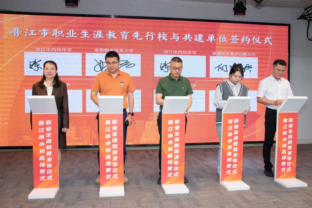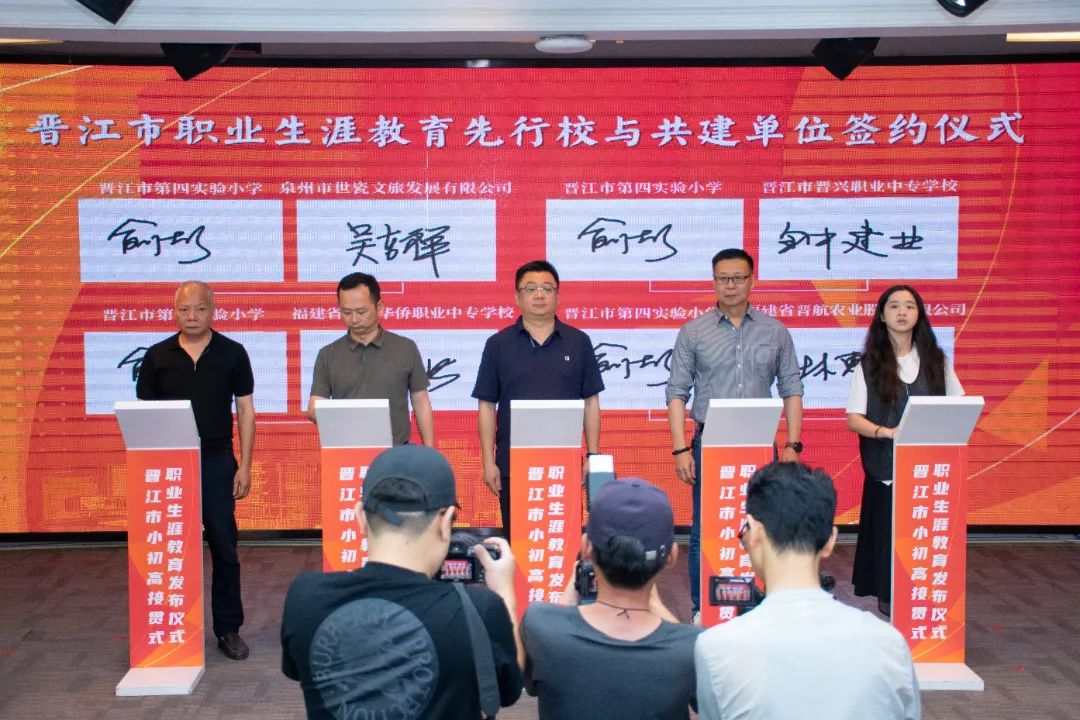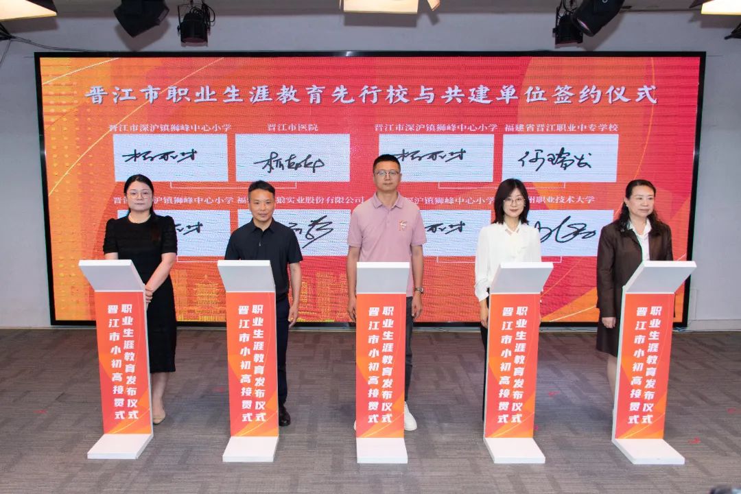 会上举行晋江市职业生涯教育先行校与共建单位的签约仪式。晋江市第二实验小学、晋江市首峰中学、泉州五中桥南校区、福建省晋江华侨职业中专学校等13所先行校与泉州职业技术大学、安踏(中国)有限公司、福建盼盼食品有限公司、福建恒安集团有限公司、福建省晋江华侨职业中专学校、晋江市晋兴职业中专学校等共建单位将携手并进,开展跨界融合,为职业生涯教育注入强劲动能,让教育从“单向输出”转向“共生共创”。