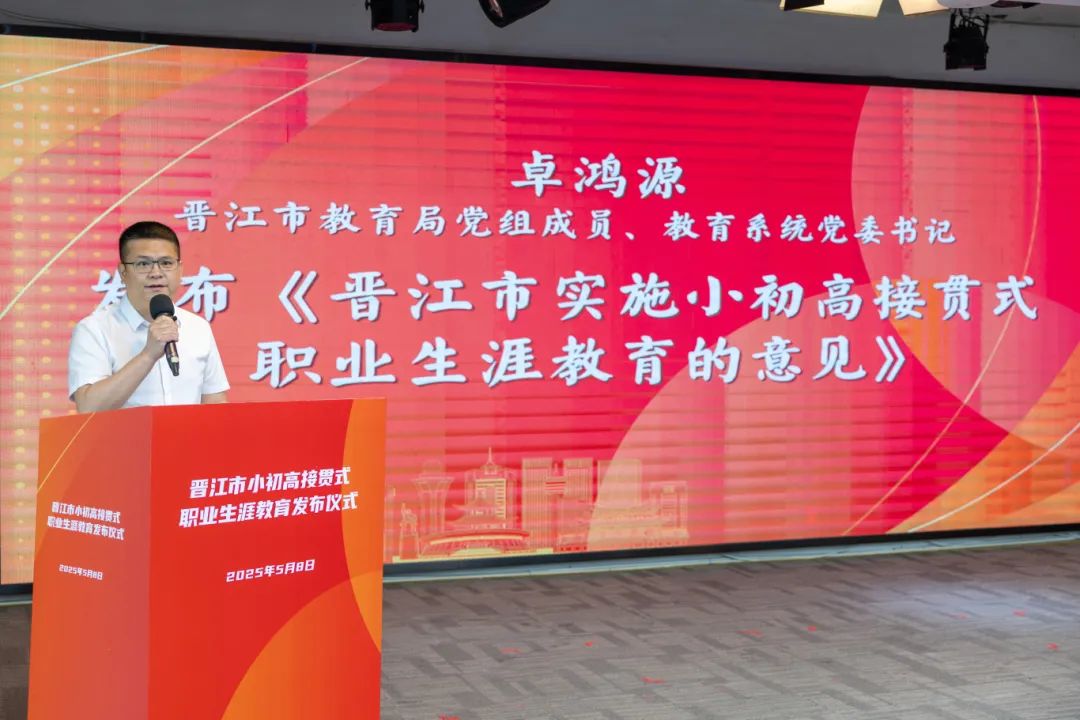 启动活动举行了晋江市小初高接惯式职业生涯教育发布仪式。卓鸿源正式发布《晋江市实施小初高接贯式职业生涯教育的意见》。他强调,晋江市小初高接贯式职业生涯教育,旨在为青少年搭建个人与职业世界的桥梁。通过系统的教育引导,让学生们初步认识和了解现代社会的各种职业,树立平等、正确的职业观念,激发他们对未来的思考与探索,培育成长成才的志趣志向,进而帮助学生形成正确的世界观、人生观、价值观。