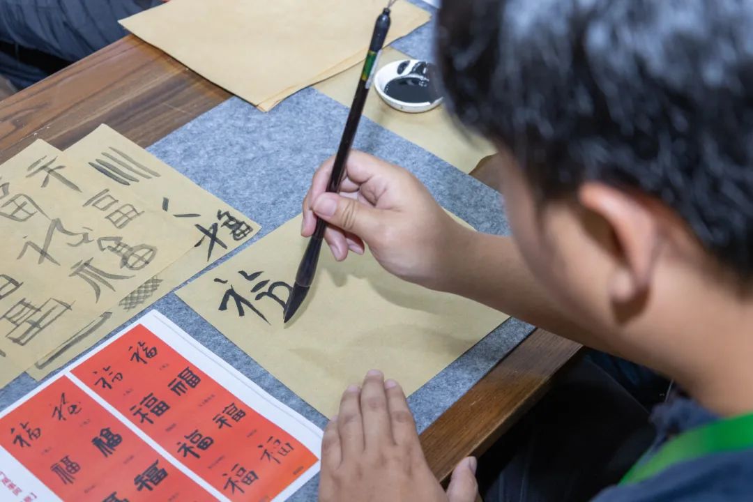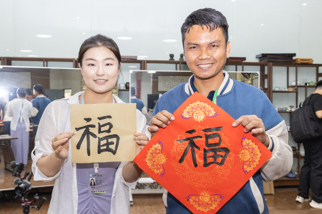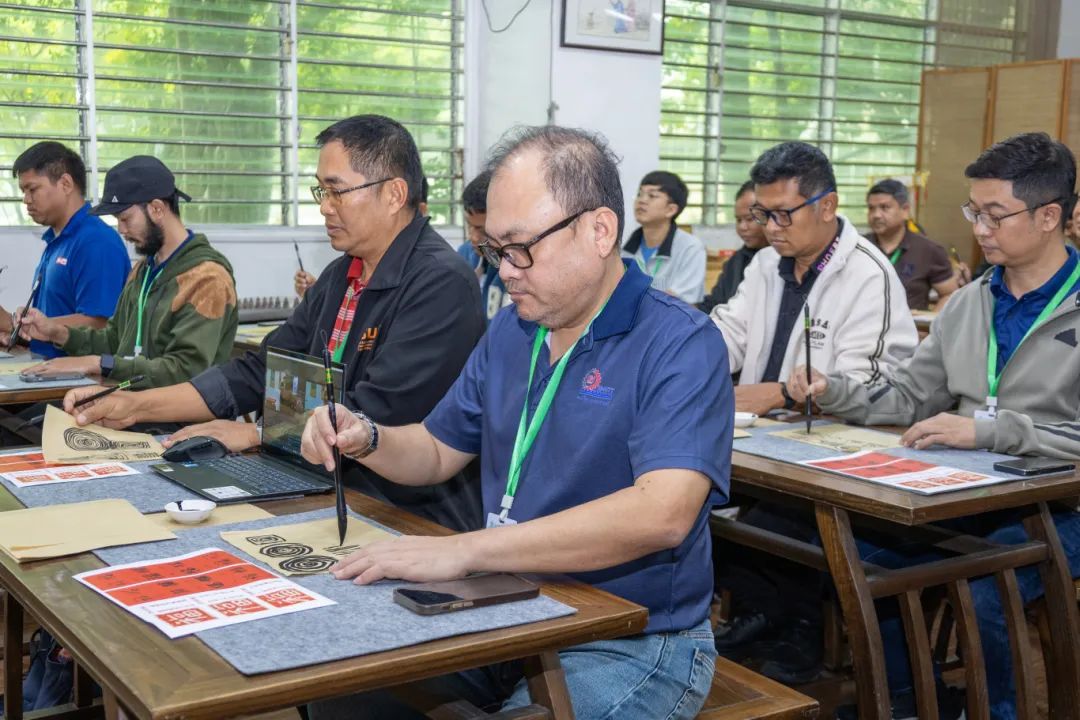 “通过了解一个国家的文字来了解一个国家的文化,是一种非常重要的方式。”在体验环节中,洪老师耐心地为学员们讲解中国书法的特点并演示篆、隶、楷、行草不同书体的写法。大家拿起毛笔认真书写,感受着毛笔在纸张上行走的魅力。学员Attaphon认真地用毛笔写了一个大大的“福”字,他说自己很喜欢中国文化,曾花了很多时间学习中文,“中华文化非常有魅力。”