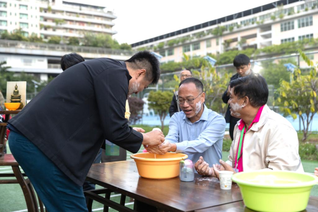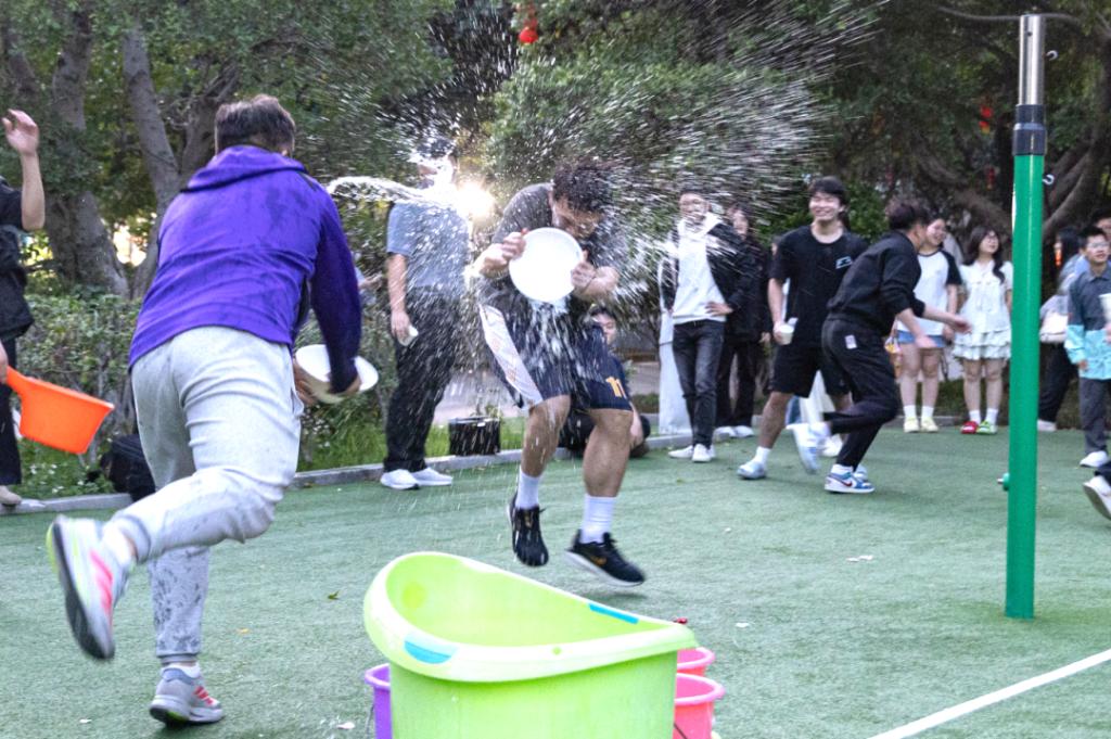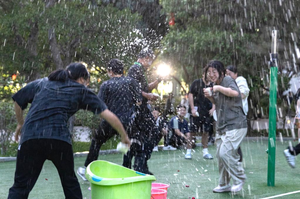 到场的师生们也兴致勃勃参与其中,感受这一独特的礼仪文化。随后,泼水互动环节将活动推向高潮,大家纷纷拿起水杯、水瓢、水盆等用具,互相泼洒清水,传递欢乐与祝福。
