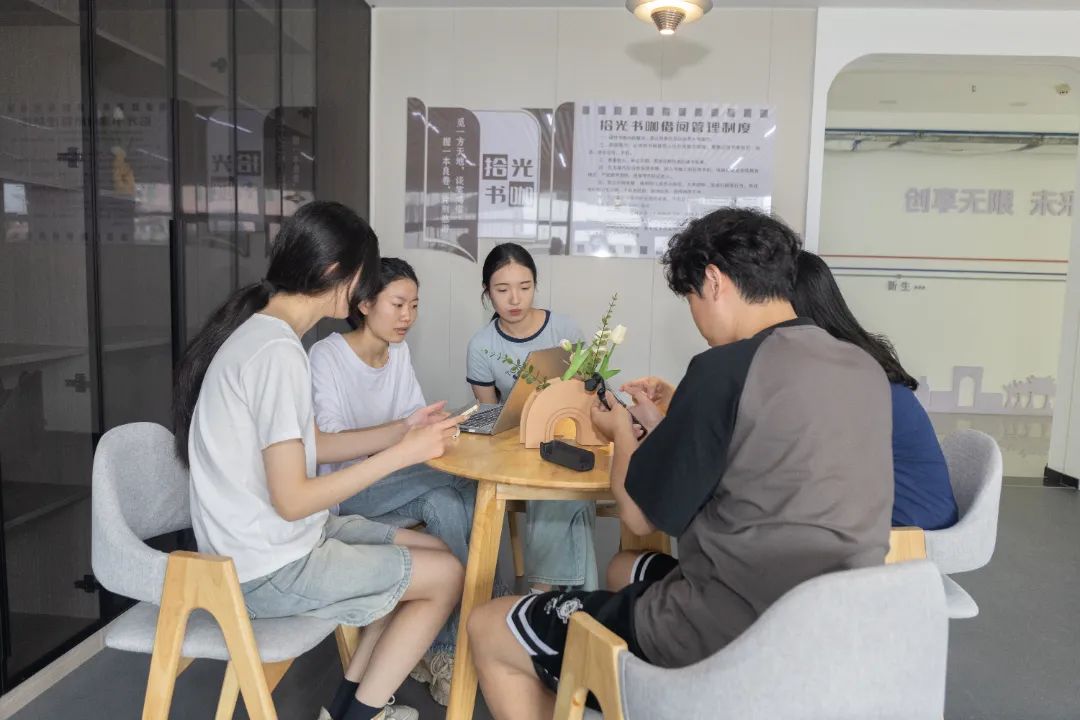 王琬艺(右一)与同学讨论媒体运营