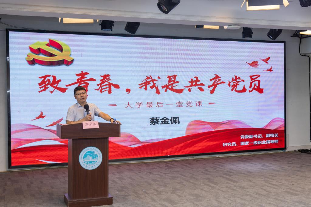 党委副书记、副校长蔡金佩为学生党员讲授“致青春,我是共产党员”专题报告。蔡金佩立足学校发展实际,从三个维度展开讲授:一是系统阐述了吴金营董事长的办学理念精髓;二是通过详实案例回顾了学校艰苦创业的发展历程;三是结合自身多年党建与学生教育管理工作经验,深入解读了新时代共产党员的使命担当。他对毕业生党员提出殷切期望,希望大家在新的工作岗位上永葆党员本色,将个人理想融入国家发展,以实干担当彰显共产党员的先锋本色,为实现中华民族伟大复兴贡献青春力量。