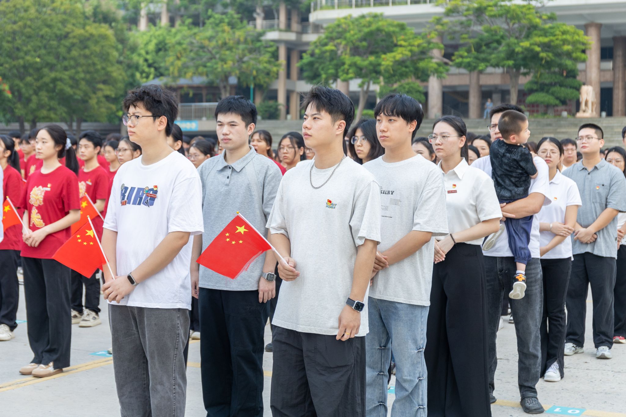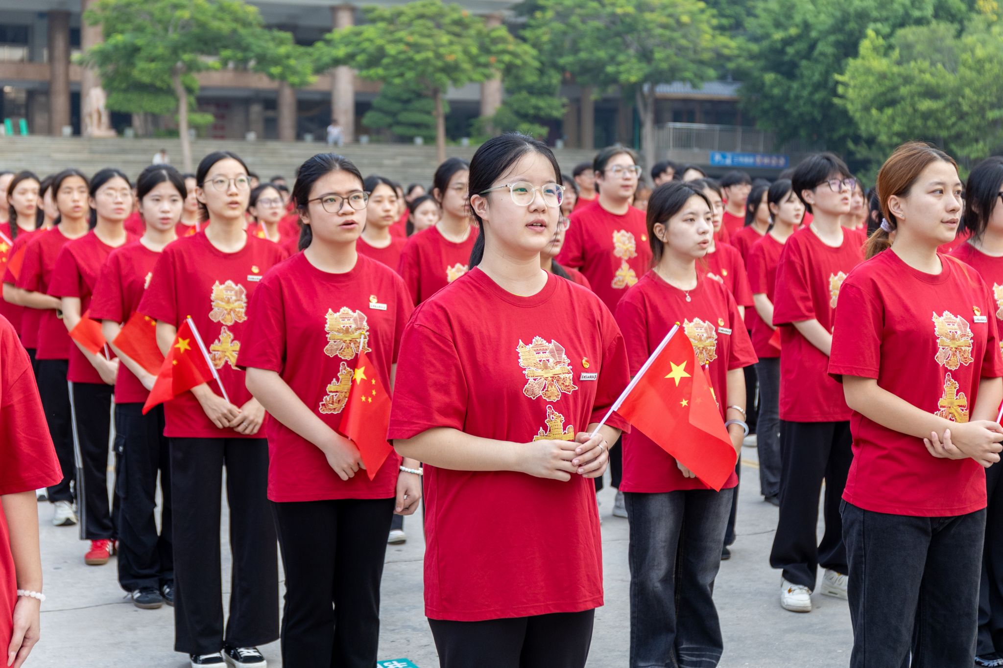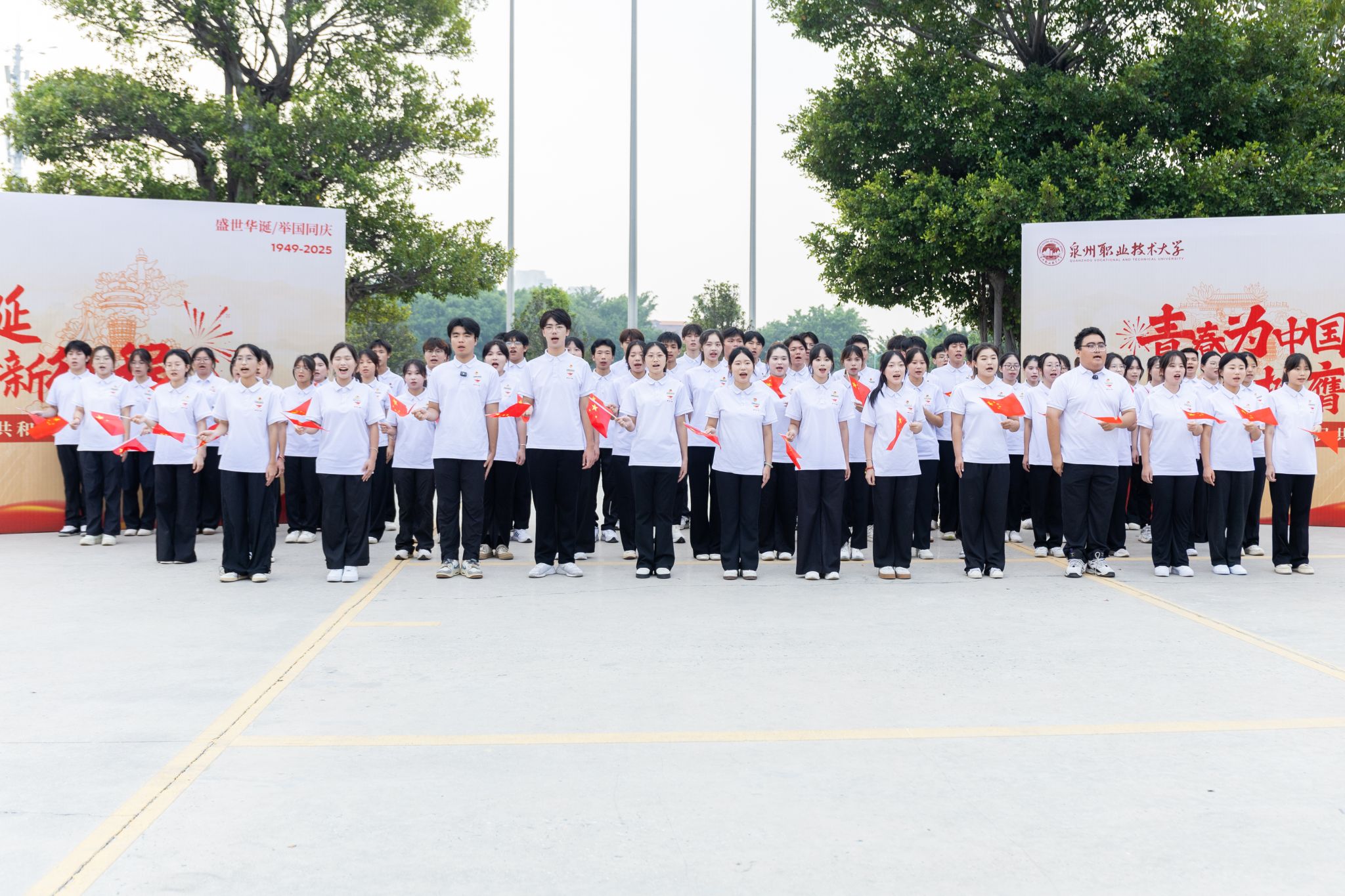 “五星红旗迎风飘扬,胜利歌声多么响亮……”升旗仪式尾声,全体师生齐声高唱《歌唱祖国》,嘹亮的歌声回荡在校园每个角落。师生们挥舞着小国旗,眼中闪烁着激动的光芒,用最真挚的歌声传递对祖国的祝福,用最昂扬的姿态展现泉大青年的活力。