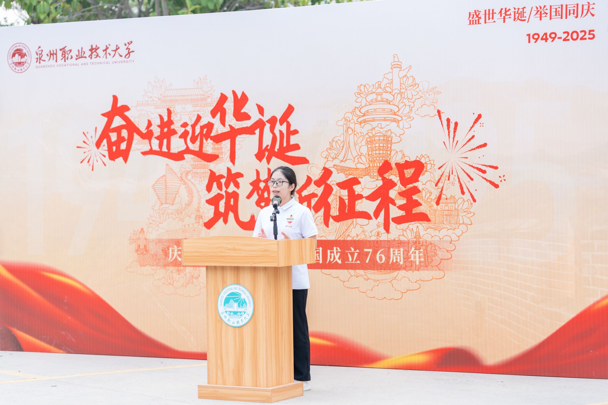 10月1日清晨,泉州职业技术大学师生代表齐聚国旗下,举行庆祝中华人民共和国成立76周年升旗仪式。校党委书记傅志雄、校党委副书记/副校长蔡金佩等校领导,各学院、书院党组织书记,各部门负责人,全体辅导员与学生代表共同见证五星红旗冉冉升起,以青春之名向祖国深情告白。