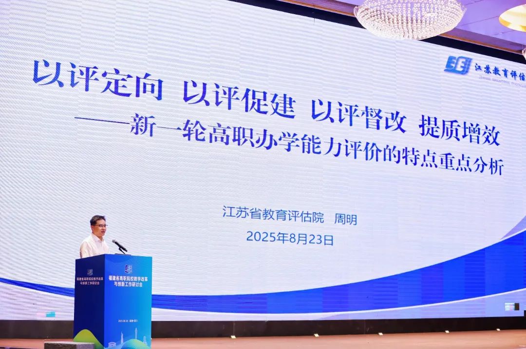 福建省教育评估研究中心主任范菁作《数智赋能推进福建高等职业学校办学能力评价》的报告,梳理了福建省高职质量数据监测与评估的发展脉络,并立足实践提出了“福建方案”。