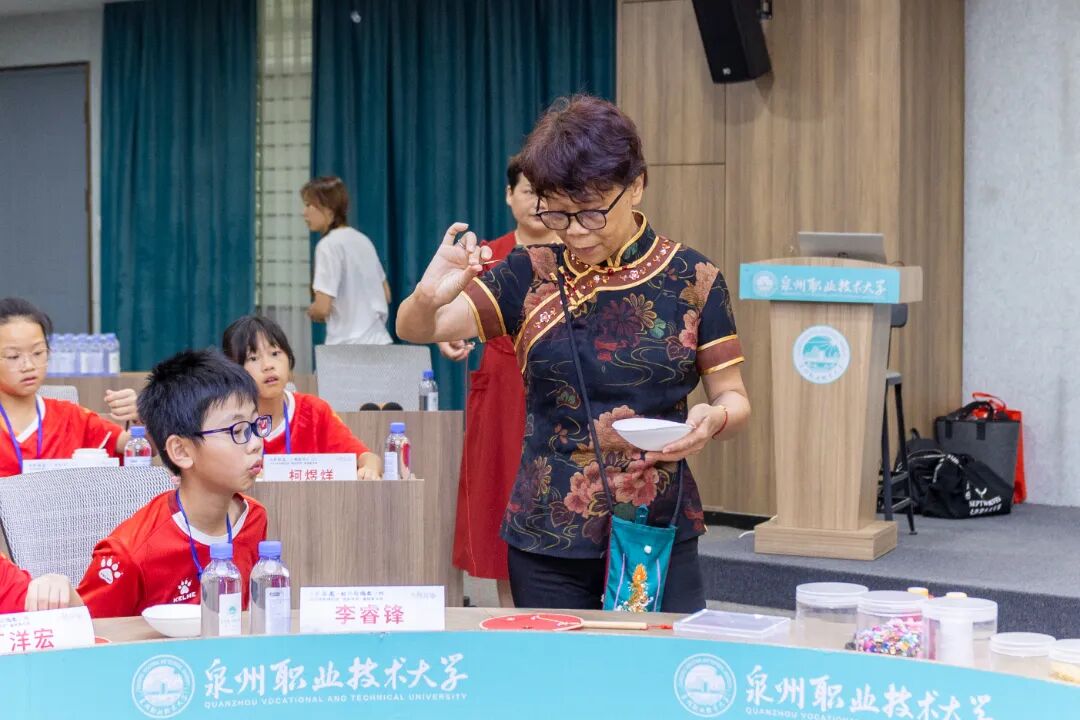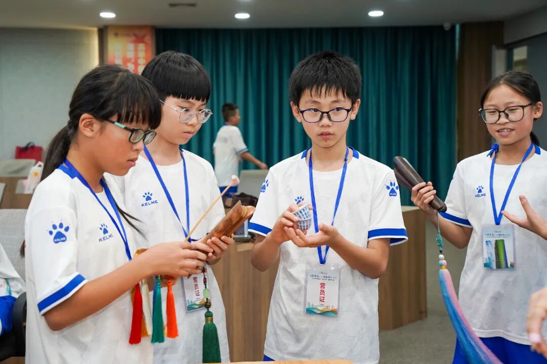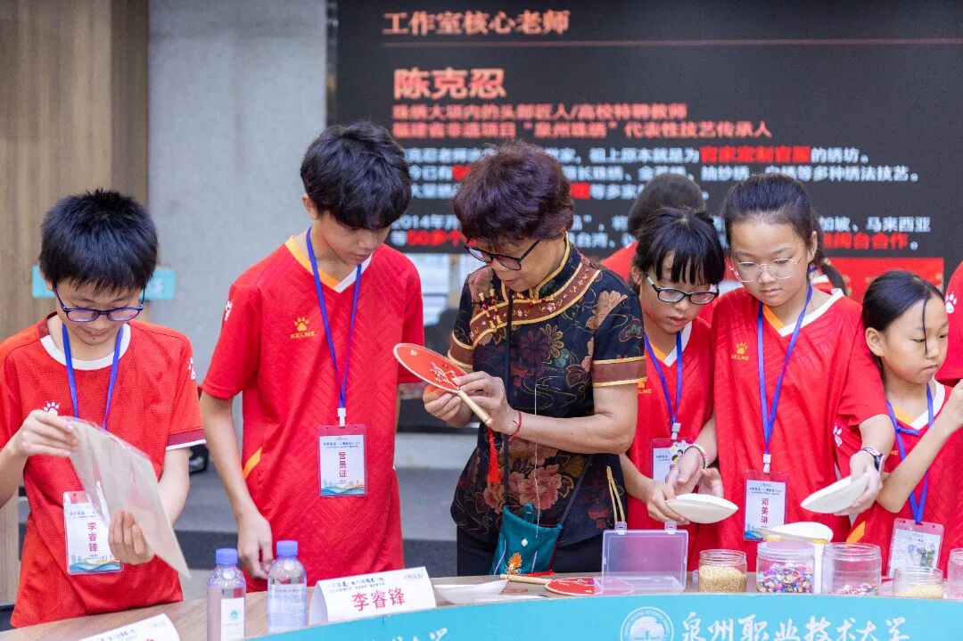在闽南歌谣课上,苏达娜老师以游戏互动的形式,让营员们在趣味中感受方言的鲜活魅力;白鹤拳课堂上,武术老师一招一式耐心指导,营员们在一静一动中领悟传统武术的“内外兼修”;世遗南音唱腔实践课上,悠扬的洞箫声与清亮的童声交织,跟着大师学发声的营员们,用稚嫩的嗓音演绎着千年雅乐的余韵;在非遗珠绣传承人陈克忍大师的指导下,孩子们用细如发丝的绣线将彩色珠子缝制在团扇上,一针一线间,非遗技艺不再是书本上的文字,而是可触摸、可传承的文化记忆。