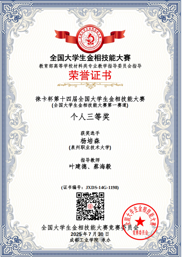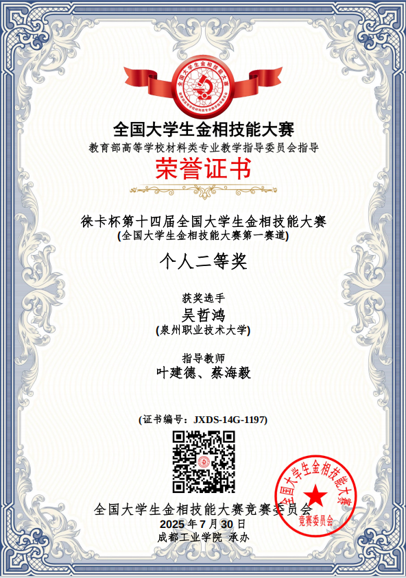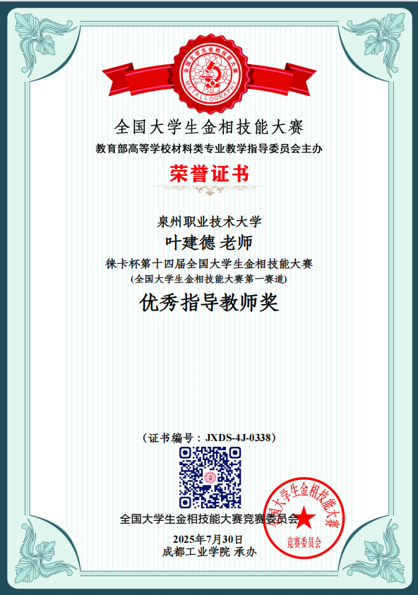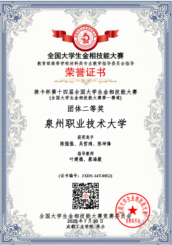 7月25日至30日,由教育部高等学校材料类专业教学指导委员会主办的“徕卡杯”第十四届全国大学生金相技能大赛,我校在工学院叶建德、杨雪春、蔡海毅、黄绍金老师的共同指导带领下,获得全国一等奖1项、二等奖2项、三等奖1项、团体二等奖,叶建德老师荣获优秀指导教师奖。(团体奖我校在福建省排名第二,全国第52名;福州大学福建省排名第一,全国第20名)。全国大学生金相技能大赛堪称材料类专业的“武林大会”,汇聚了清华大学等全国顶尖高校的硬核高手。
