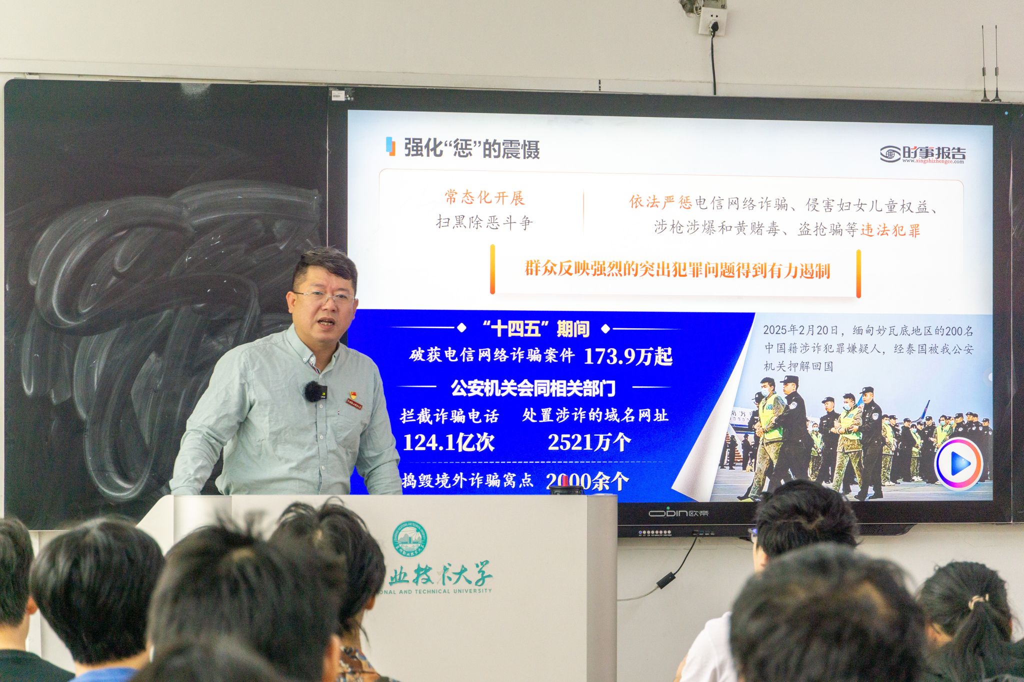 郭霏霏围绕国家安全这一重大议题,从“发展之基 民之所盼”“成果亮眼 成绩显著”“总体谋划 一体部署”三个维度展开系统阐述,深入讲解了新时代国家安全工作所发生的历史性变革、取得的历史性成就以及实现的历史性突破。他强调,要坚定不移贯彻总体国家安全观,不断夯实平安中国建设的社会基础,着力防范化解各类风险挑战,加强社会治安综合治理,坚持党对平安中国建设的全面领导。在授课过程中引导学生认识到,建设更高水平的平安中国,事关中华民族伟大复兴的宏伟事业,关乎人民群众的美好生活,更关系到国家的长治久安。