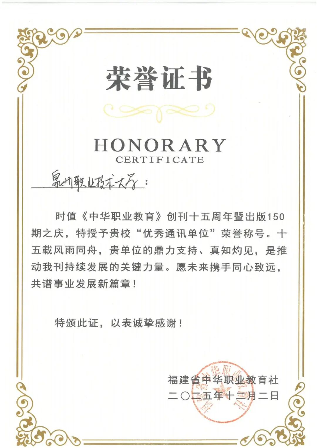 12月2日至4日,2025年福建省中华职教社系统宣传信息工作培训班在泉州举行。开班式上,泉州职业技术大学被授予《中华职业教育》“优秀通讯单位”荣誉称号。