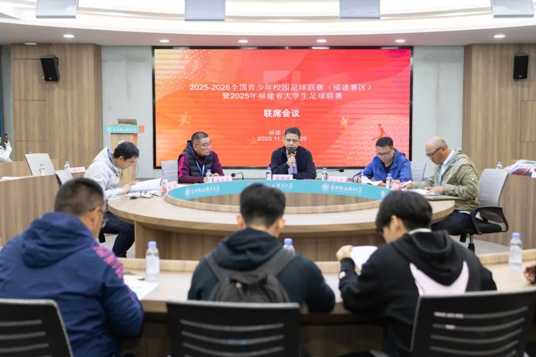 ▲ 福建省教育厅体卫艺语处处长苏贻堆、厦门市校足办竞赛管理部主任林力斌、泉州职业技术大学副校长林文艺等参加赛事联席会,对本次赛事举办做出具体指导
