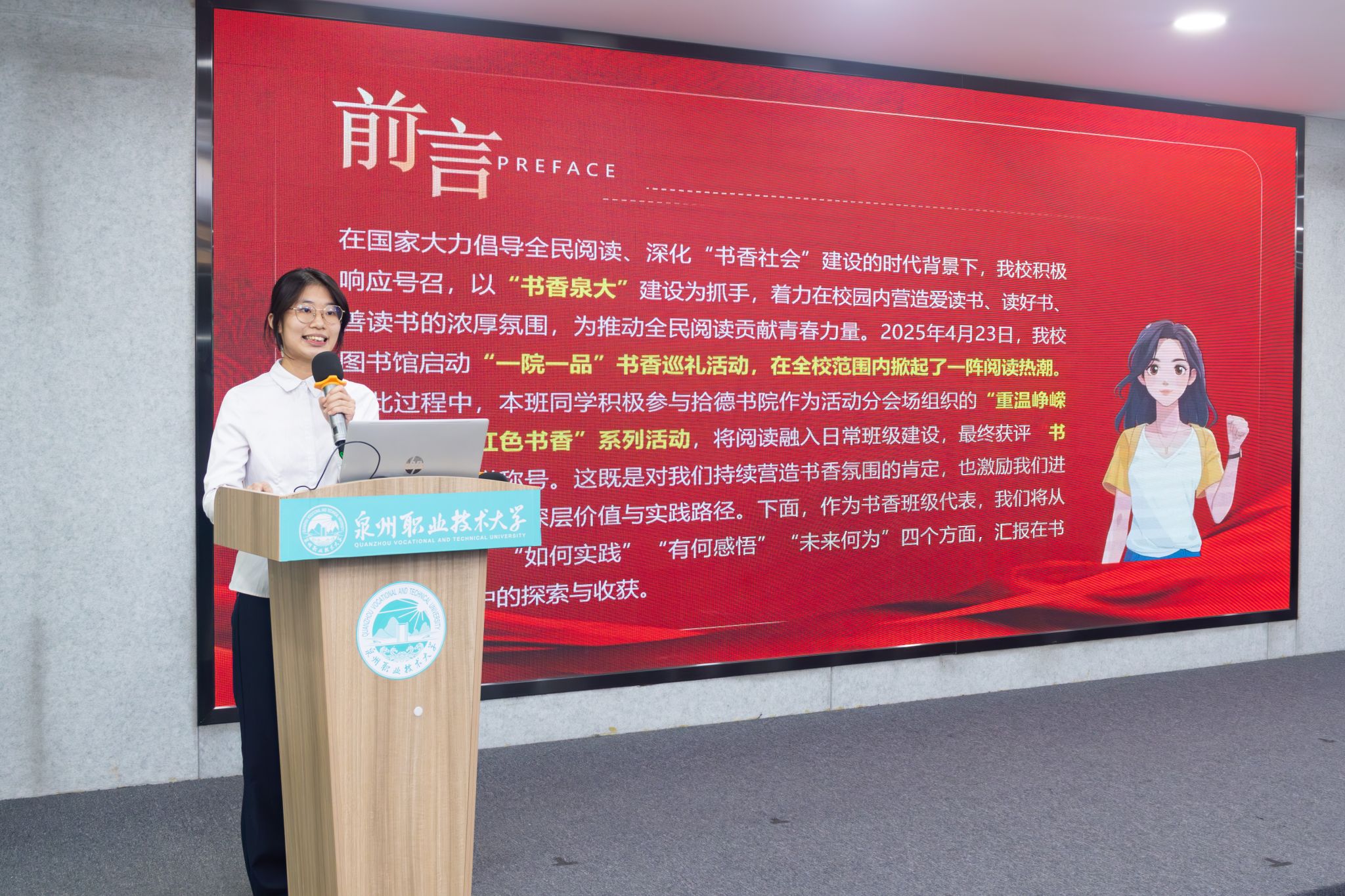 作为“书香班级”代表,2023级电子商务1班的曾雪祺同学分享了班级以“红色书香”为主线,通过读书分享、书封设计、社区服务等形式,推动阅读融入日常,实现个人、集体与社会协同成长的建设经验。
