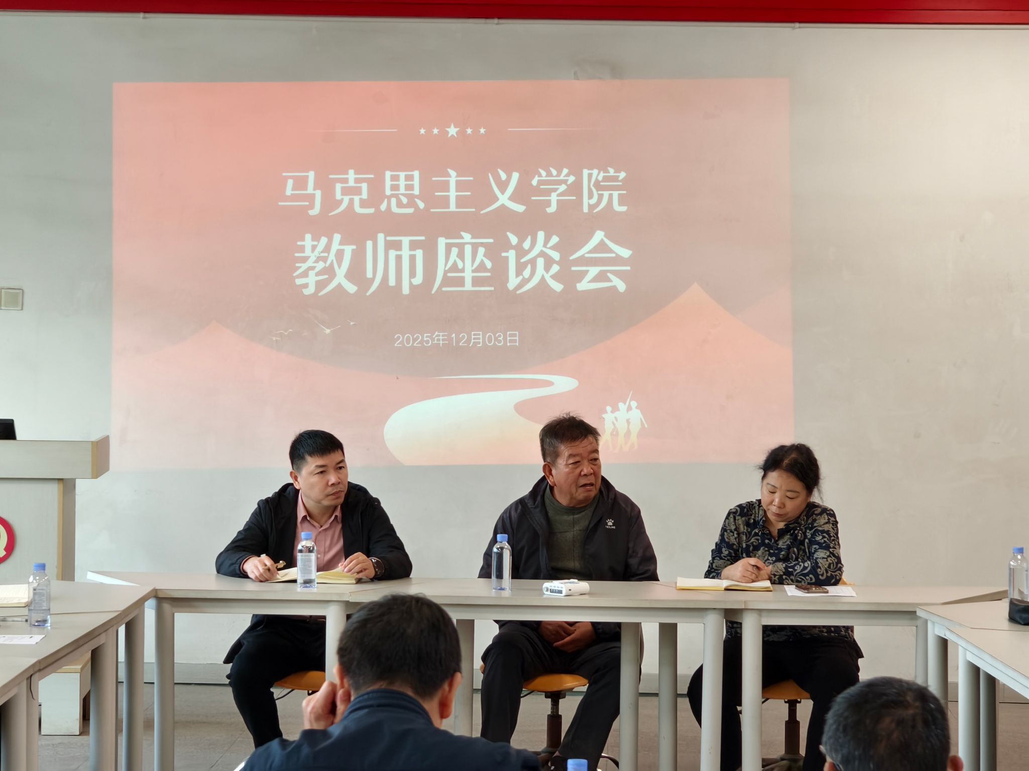 12月3日下午,董事长吴金营、副校长蔡金佩深入马克思主义学院,与全体教师亲切座谈。座谈会由马克思主义学院院长杜秀娟主持。