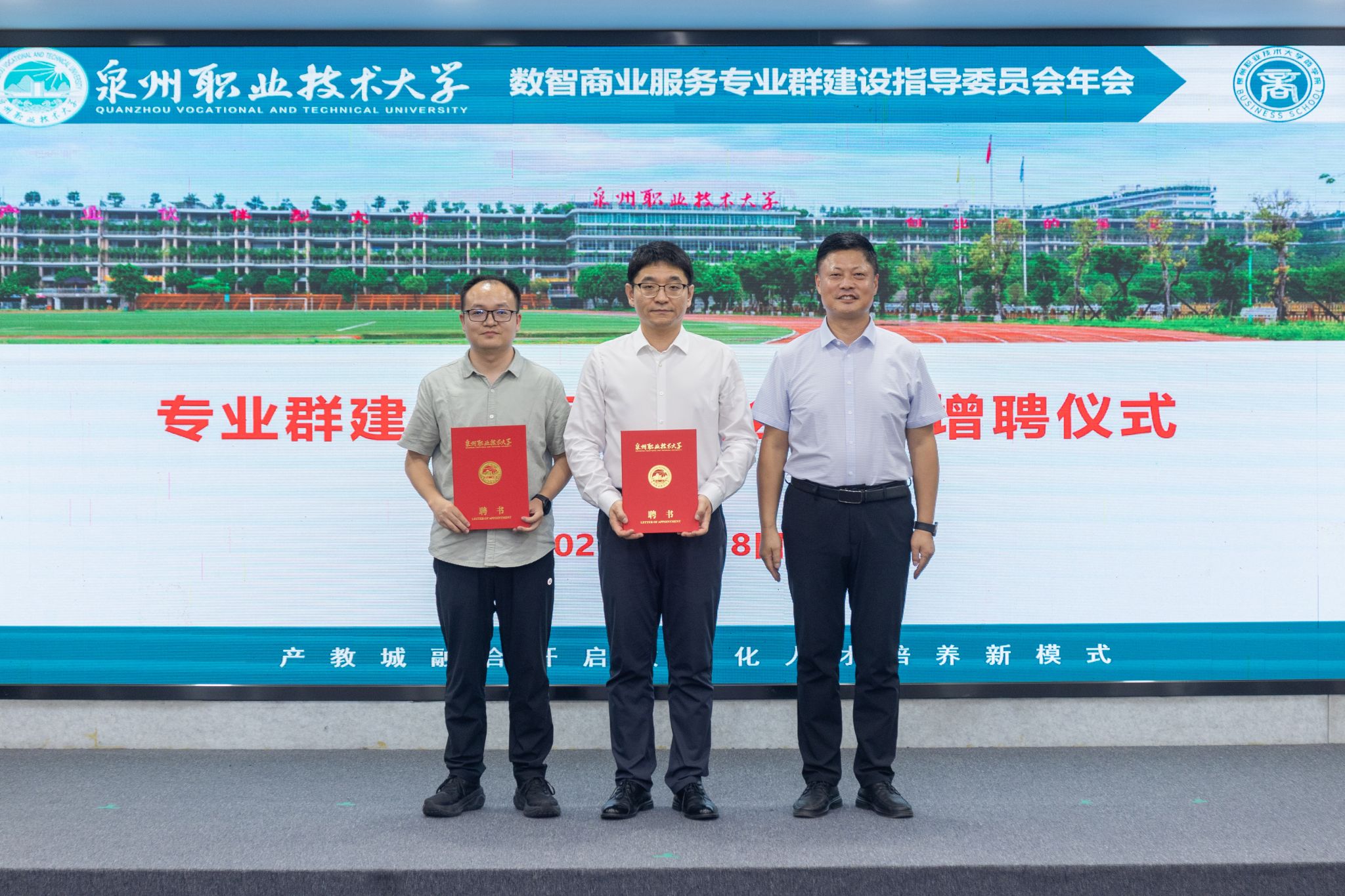 年会现场,举行了专业群建设指导委员会委员增聘仪式,华侨大学旅游学院院长助理殷杰、用友集团新道科技副总裁贾大明受聘为副主任委员,范梦晖、林世斌等10位企业高管受聘为委员。