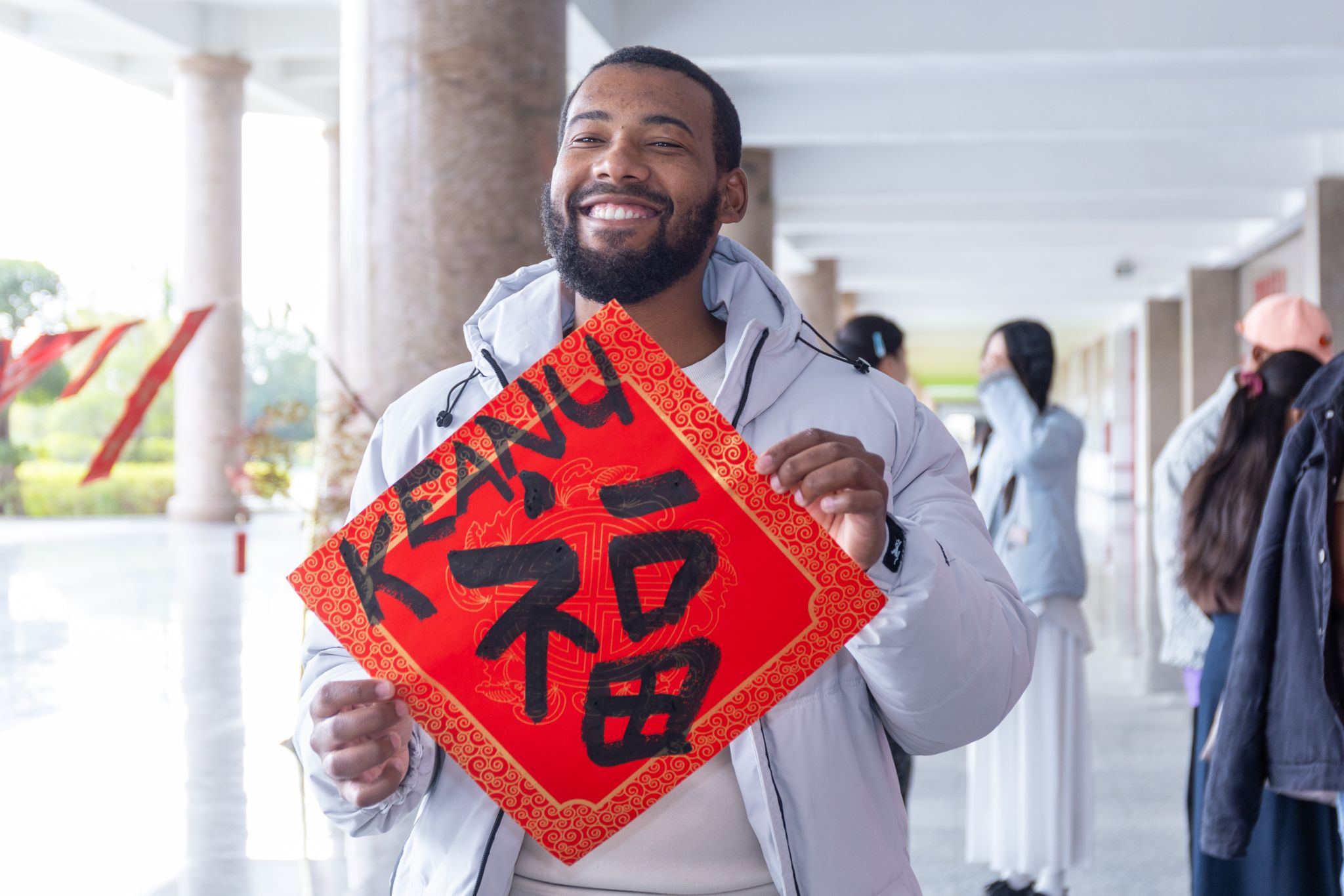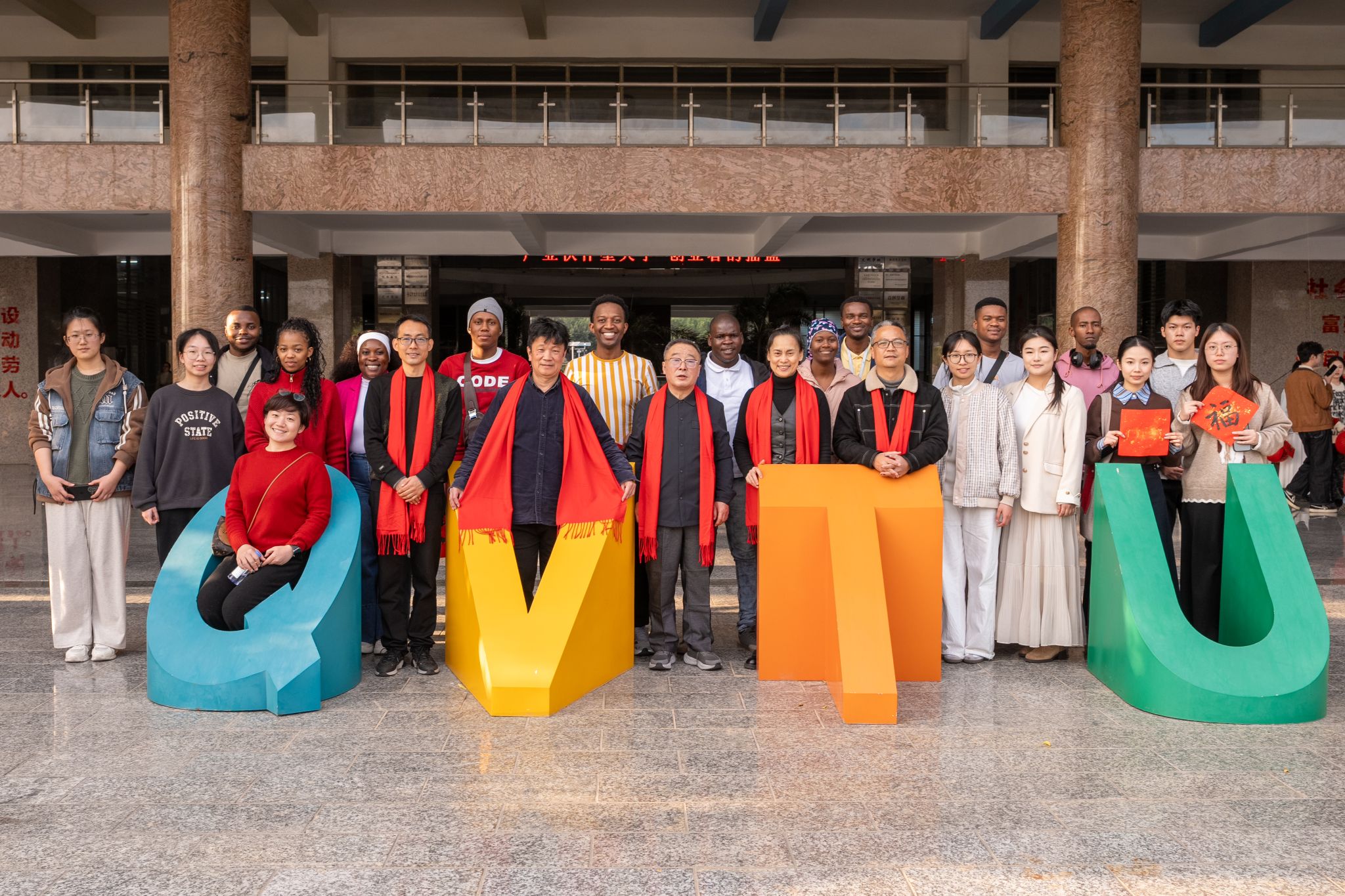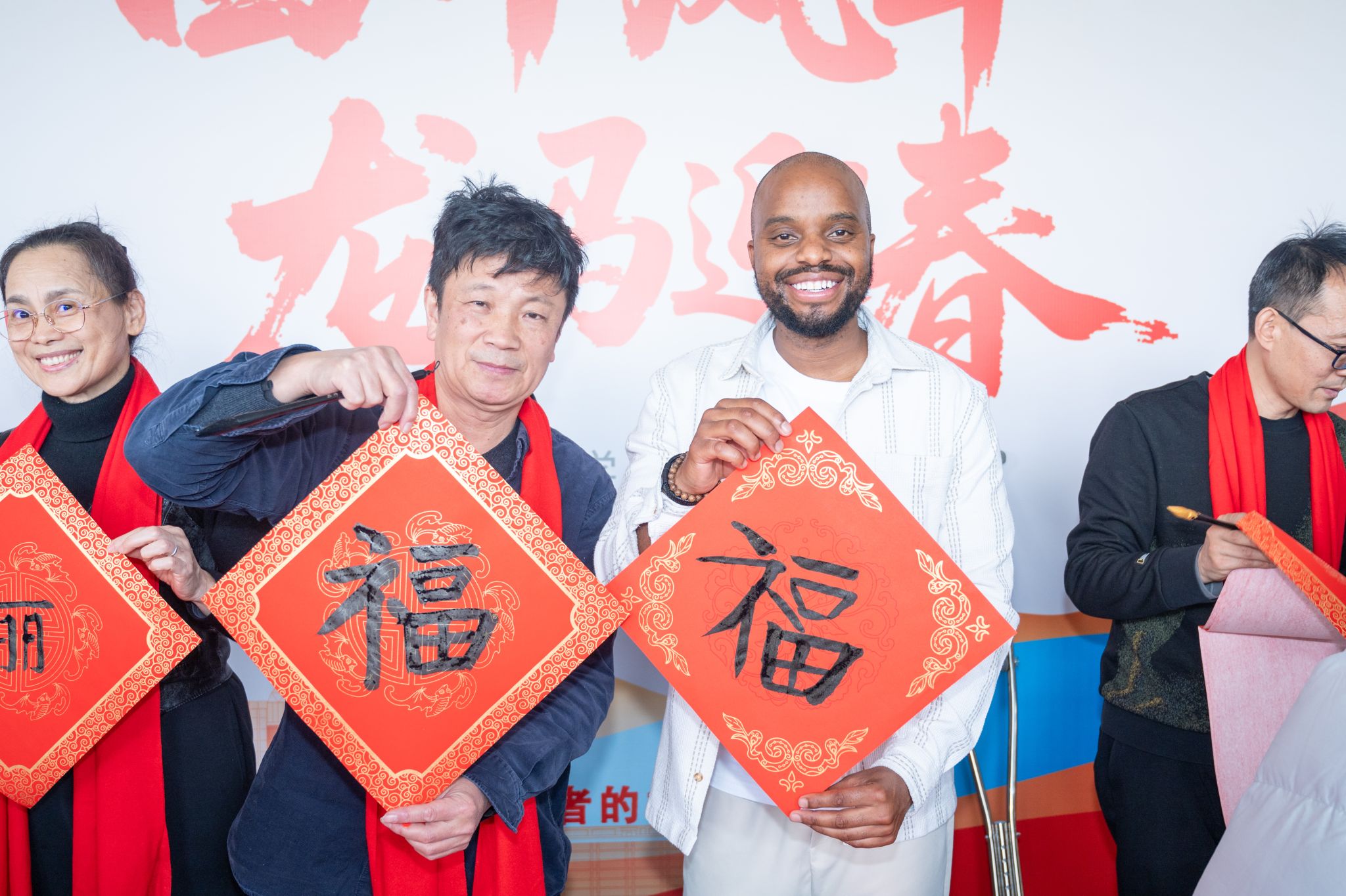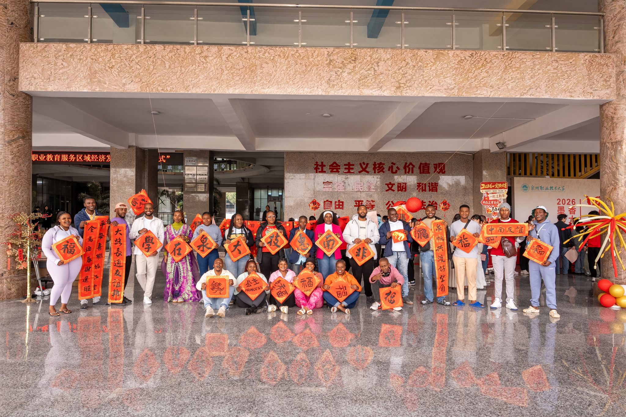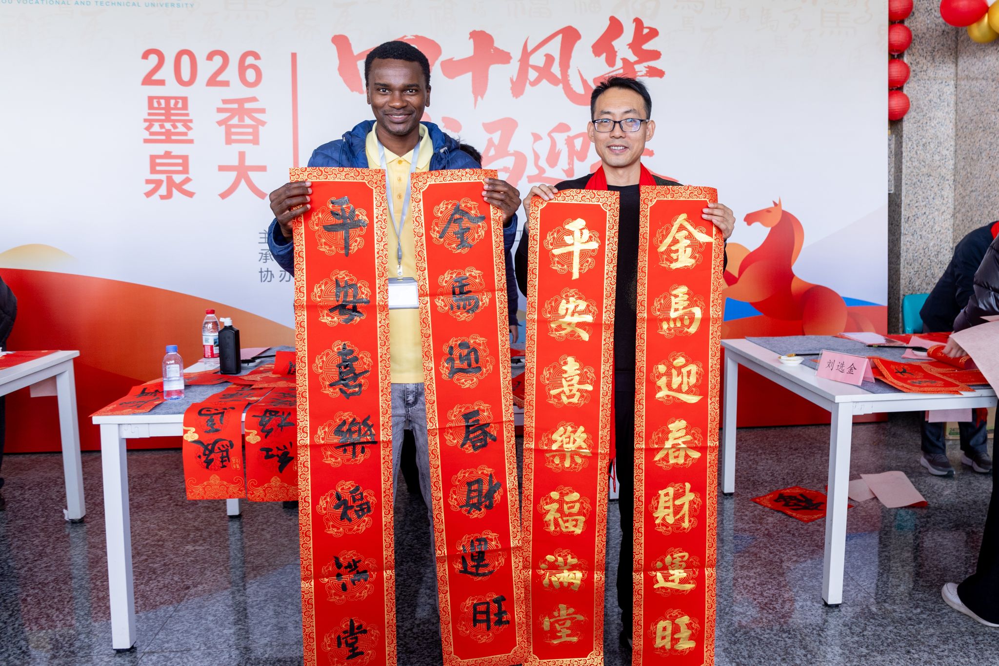 尤为特别的是,活动中还为南非学员量身创作了“泉帆共渡好望角,大路长通友谊邦”一联,横批“携手同行”,寓意中非友谊与教育合作的美好前景。通过这场送春联活动,外国青年亲身参与书法体验,正是泉大推动中华优秀传统文化传播的有力举措。